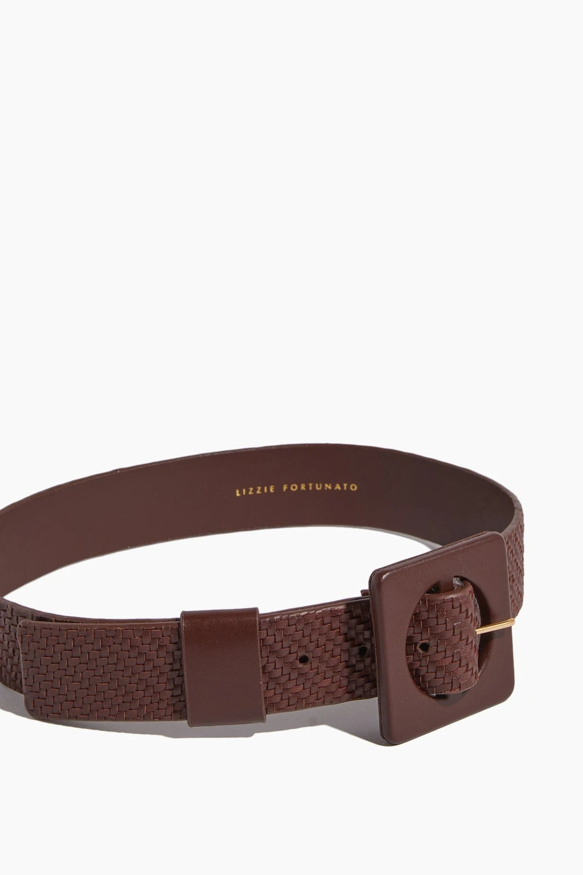 The Lizzie Fortunato Agnes Belt in Woven Espresso in Brown is a wde, woven dark brown-colored leather belt with oversized square buckle and trim.