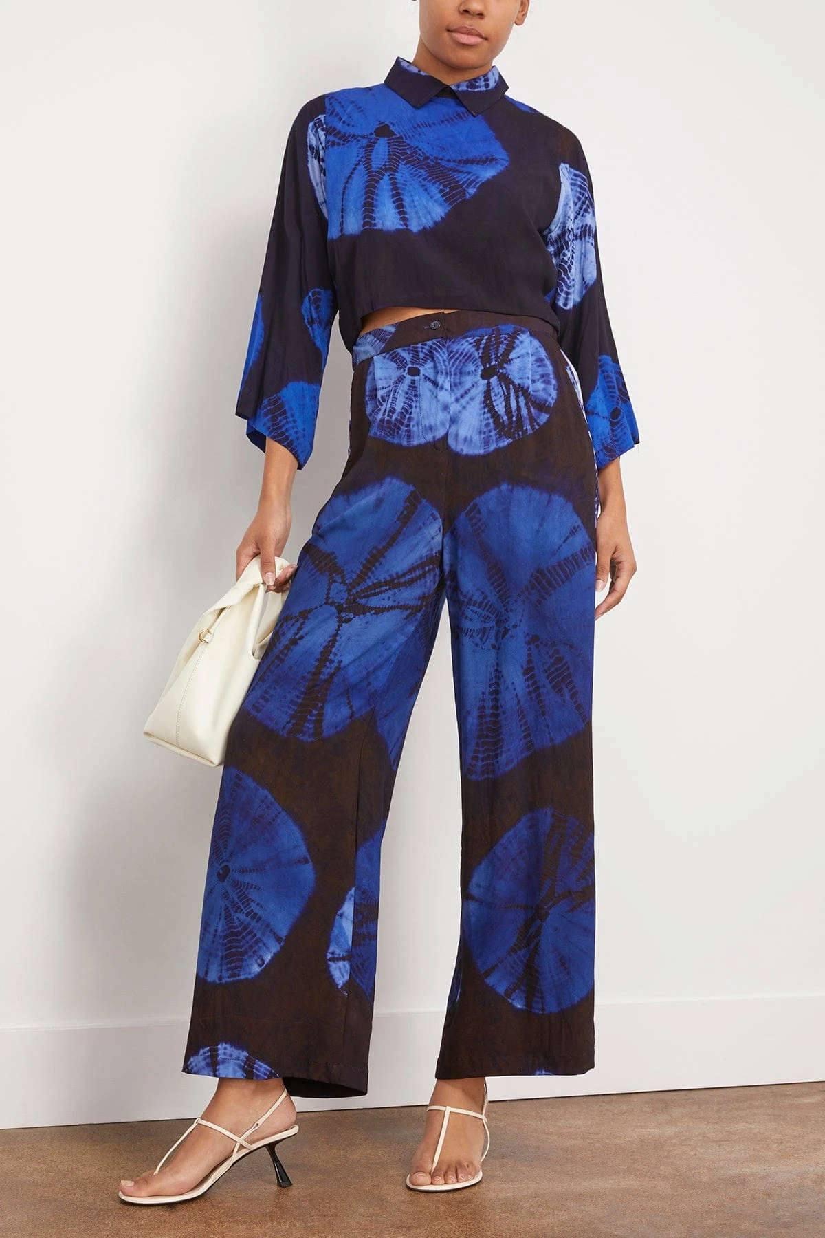The Busayo Ayokun Pant in Blue and White Tie Dye is a batik printed pant with wide straight leg. We love thispant worn with the matching top and wrap up sandals.