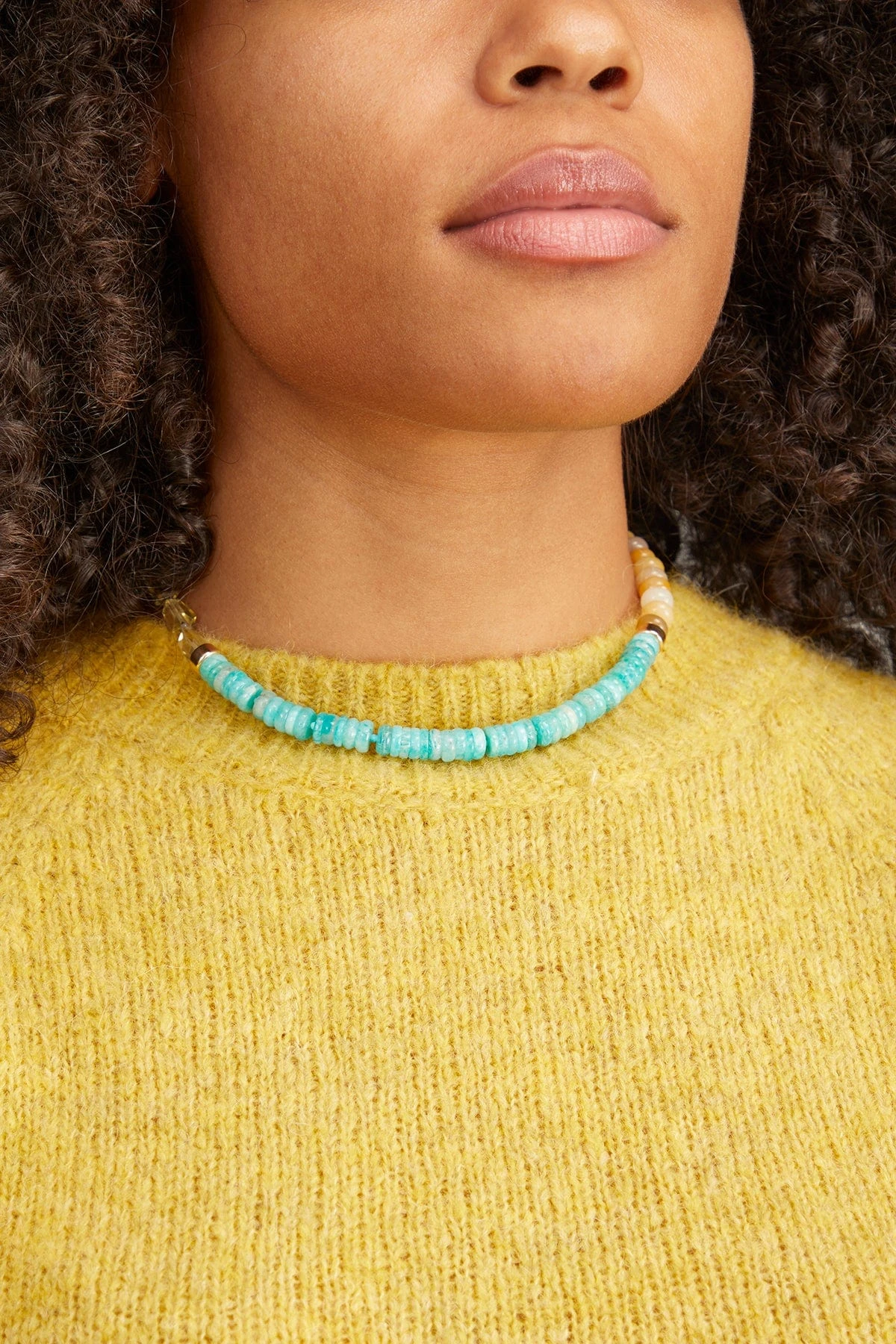 The Lizzie Fortunato Chama Necklace In Seaside is a faceted lemon quartz, yellow aventurine, and amazonite color-blocked beaded collar with tanzanite, shaded turquoise, and gold-fill bead accents and gold-plated brass toggle closure.