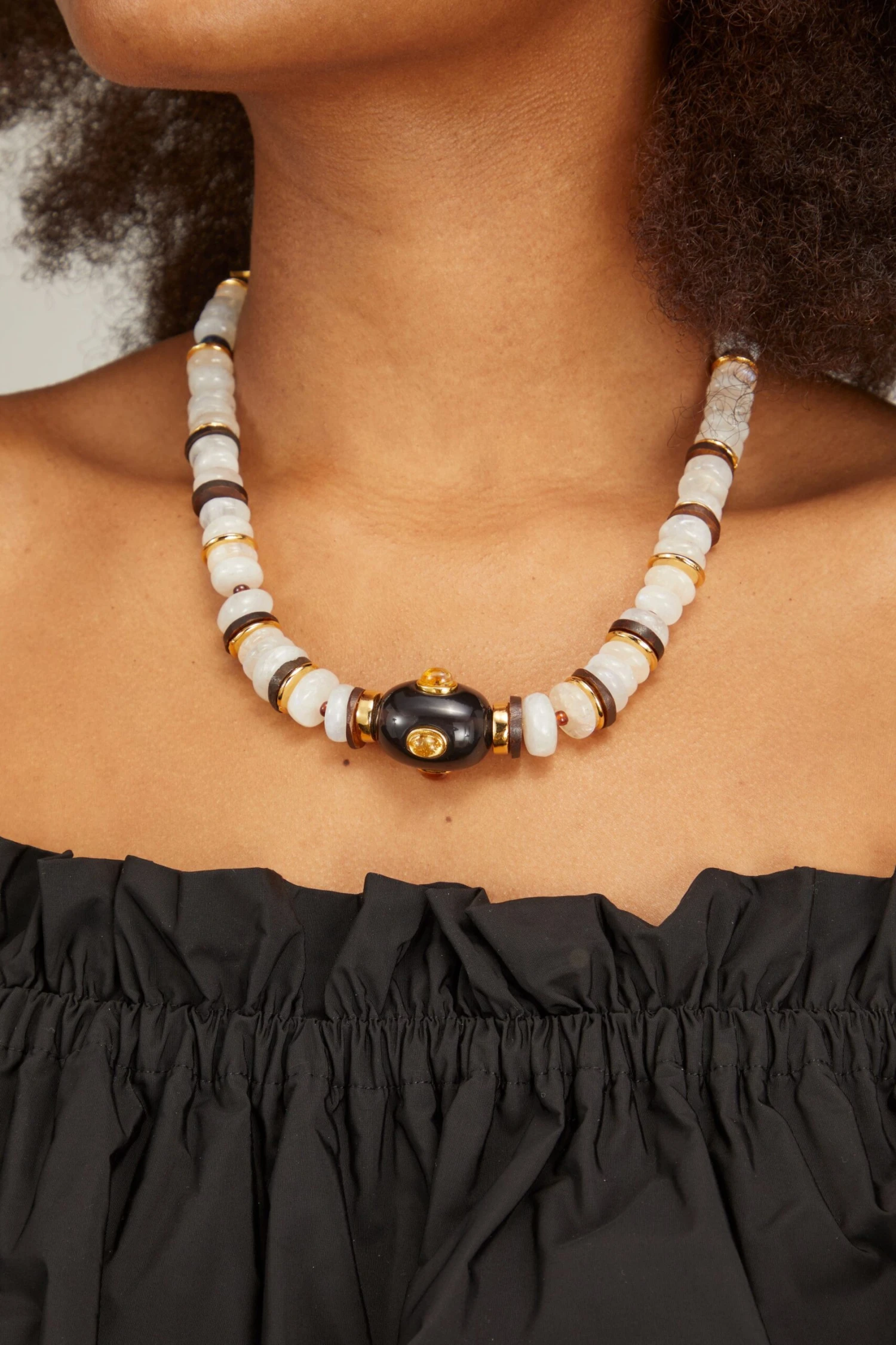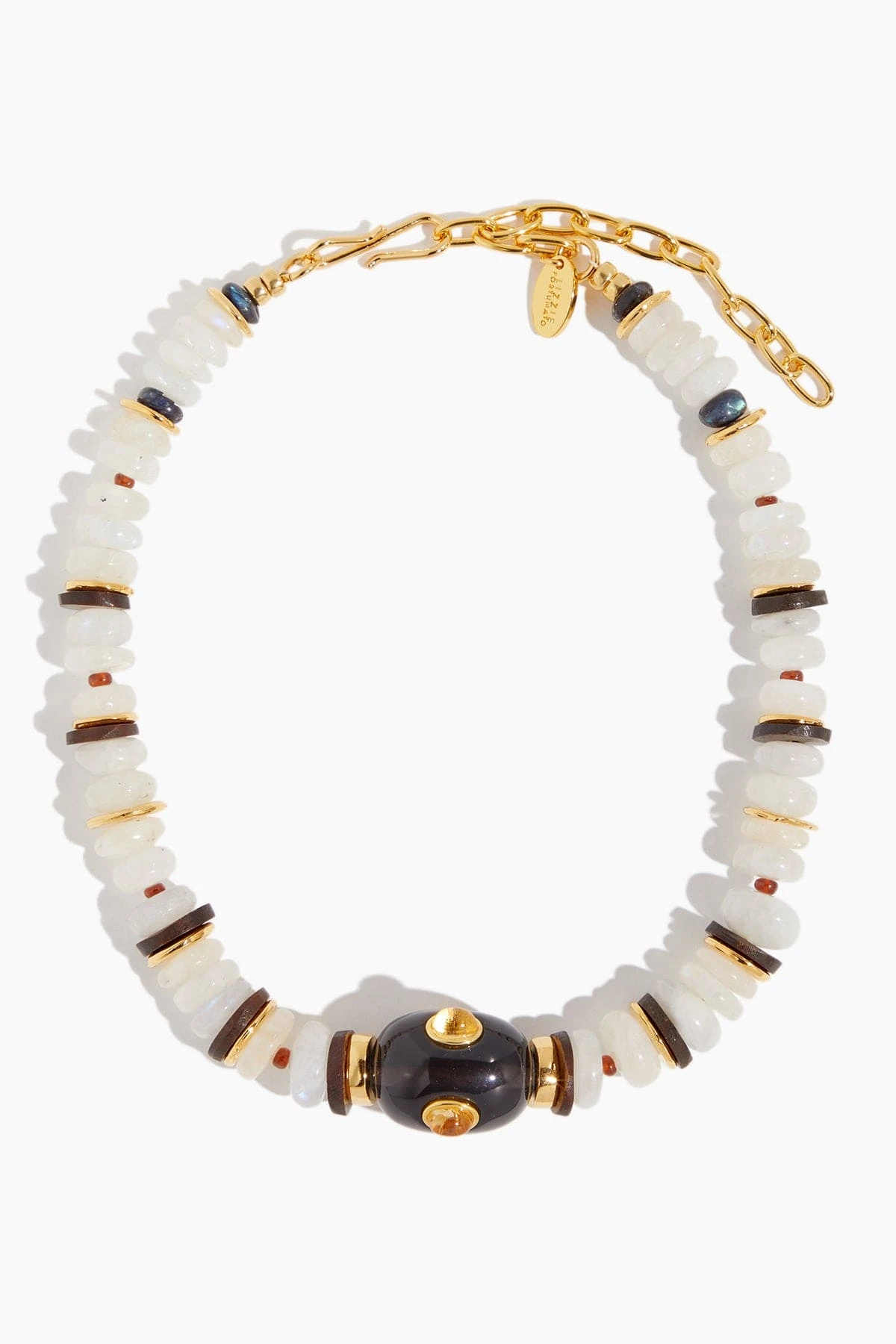 The Lizzie Fortunato Cove Collar is a must-have piece from their Resort 23 Collection. You’ll love this necklace of single-strand necklace of luxe moonstone,bone, hessonite garnet, labradorite and gold-plated brass beads.