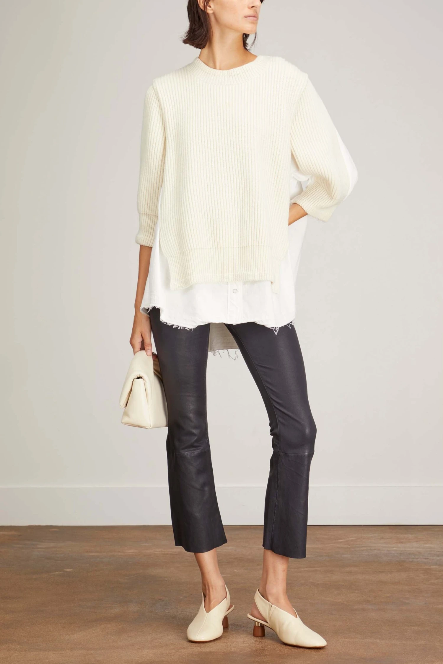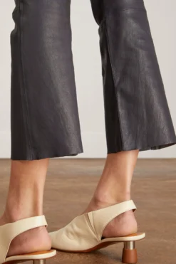 The SPRWMN Crop Flare Leggings that you love are now available in navy. These leather pants feature a pull on style with a flattering cropped flared leg. Wear yours with an oversized knit and loafers this season.