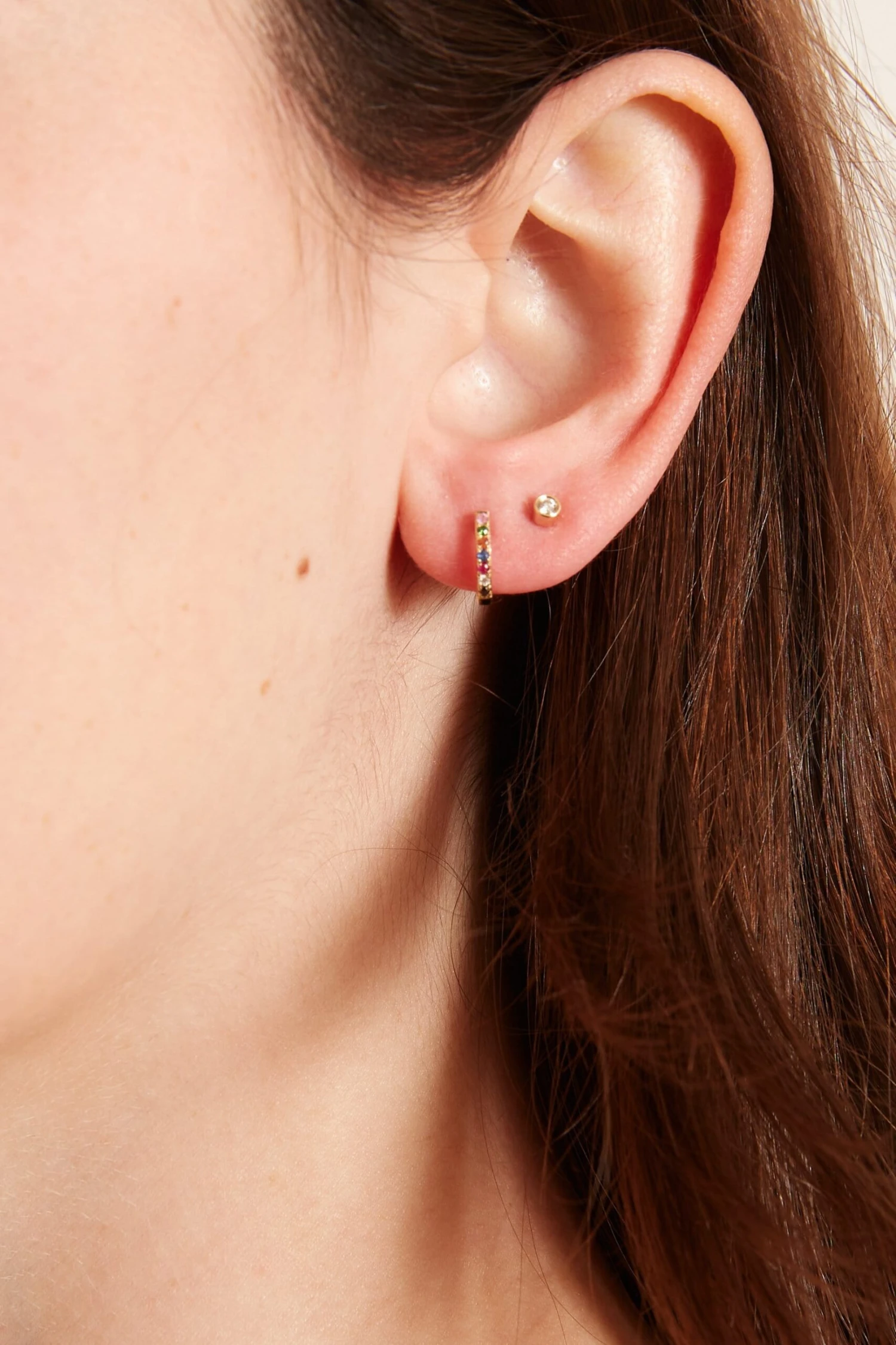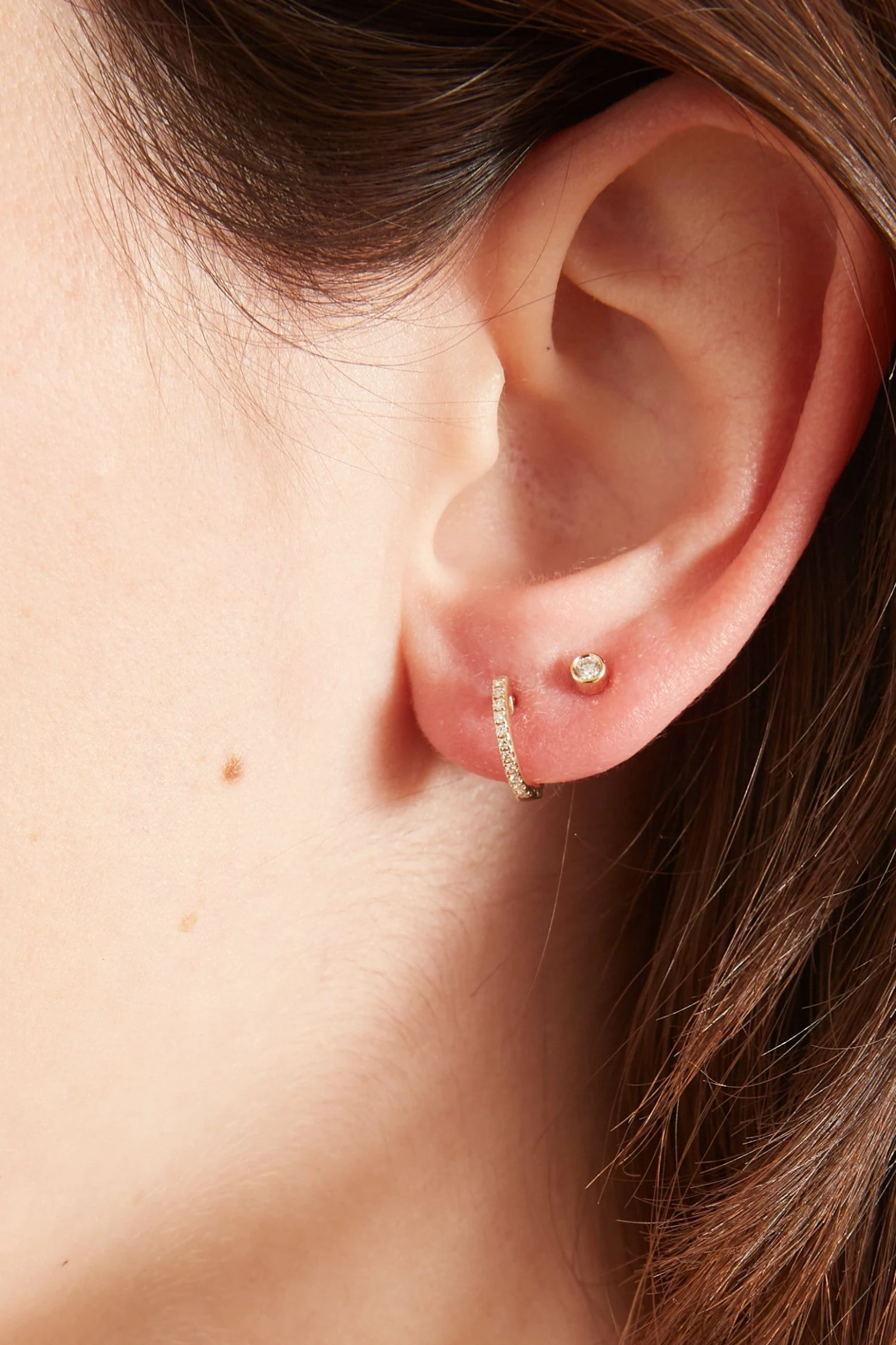 The bold and the beautiful. A single bezel-set round diamond sits at the center of this miniature stud earring that makes a truly elegant statement. Wear one, or multiples along the ear for dramatic flourish. It features 0.07 carats of diamond set in your choice of gleaming 14k yellow gold. Finished with post backs.
