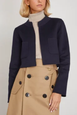 The Odeeh Double Face Cashmere/Wool Jacket in Navy features a straight, cropped fit, collarless design, and patch pockets.