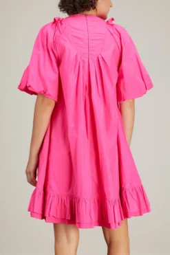 The Odeeh Dress in Neon Pink features a unique bib front. You’ll love the ruffle detailing of this crisp cotton midi dress. Wear yours with sandals and a tote bag.