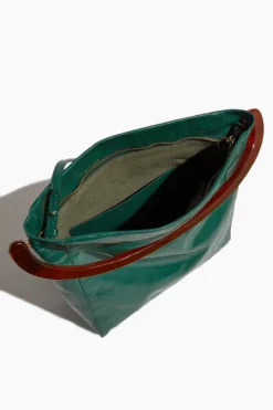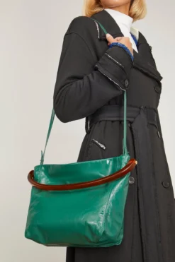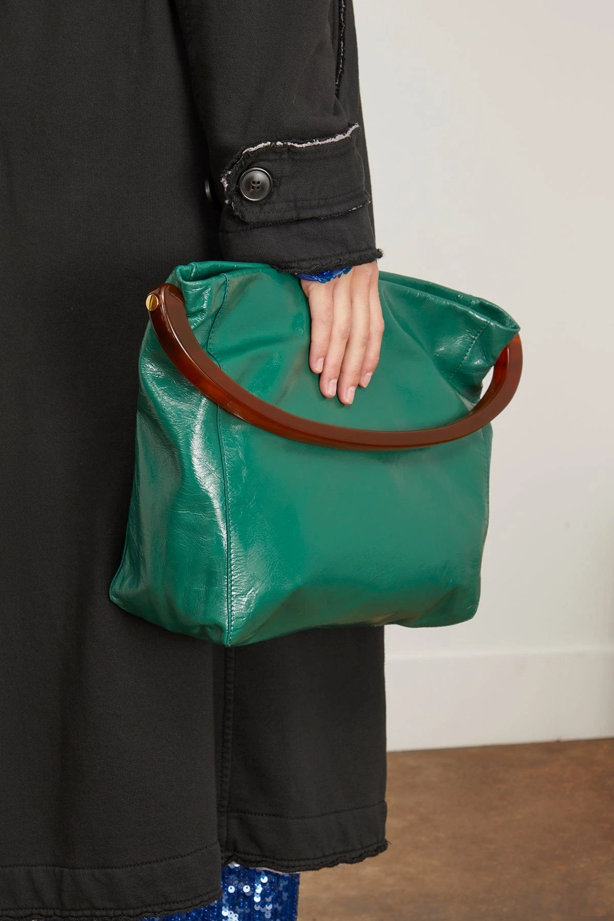 The Dries Van Noten Crisp Top Handle Bag in Petrol is a beautiful, structured bag that can be worn as a top handle bag or a shoulder bag.