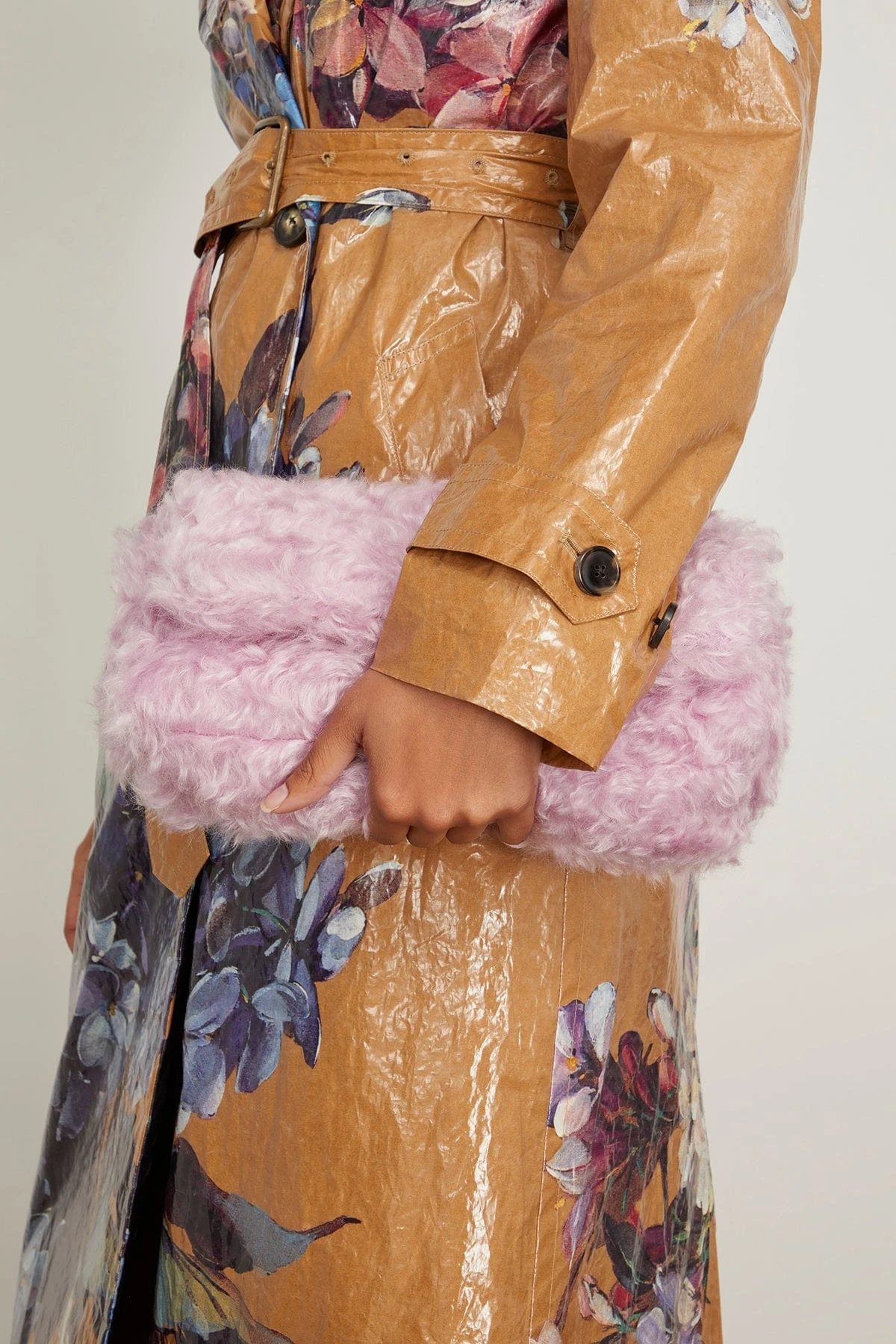 The Dries Van Noten Fluffy Folded Clutch in Lilac in leather and faux fur is funky clutch that elevate any outfit.