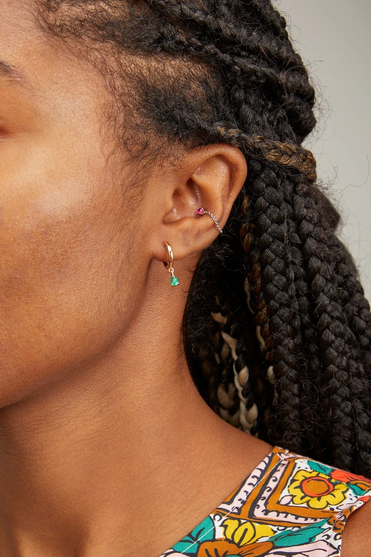 The Theodosia Emerald Drop Huggies feature a singular Emerald dangling from each of the huggies. A classic addition to your earring collection.