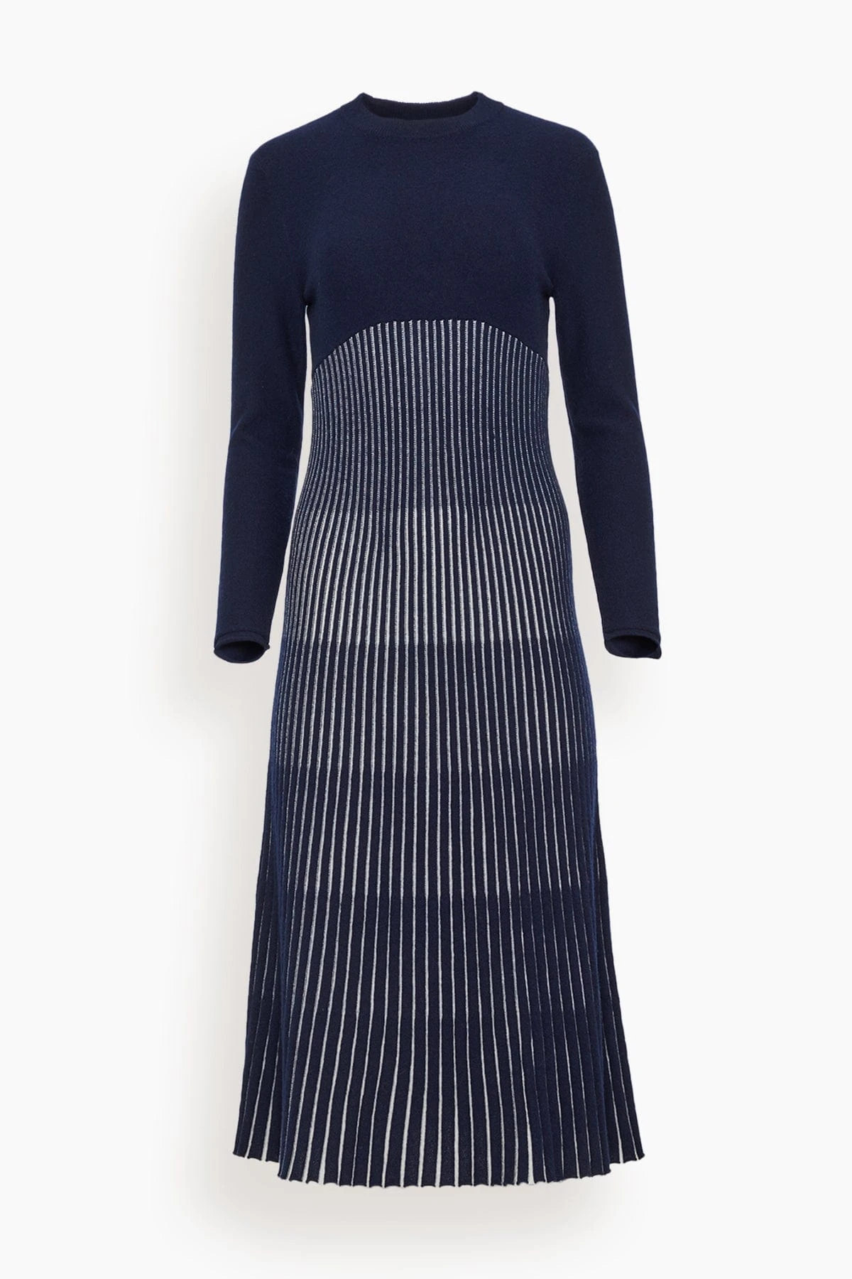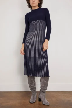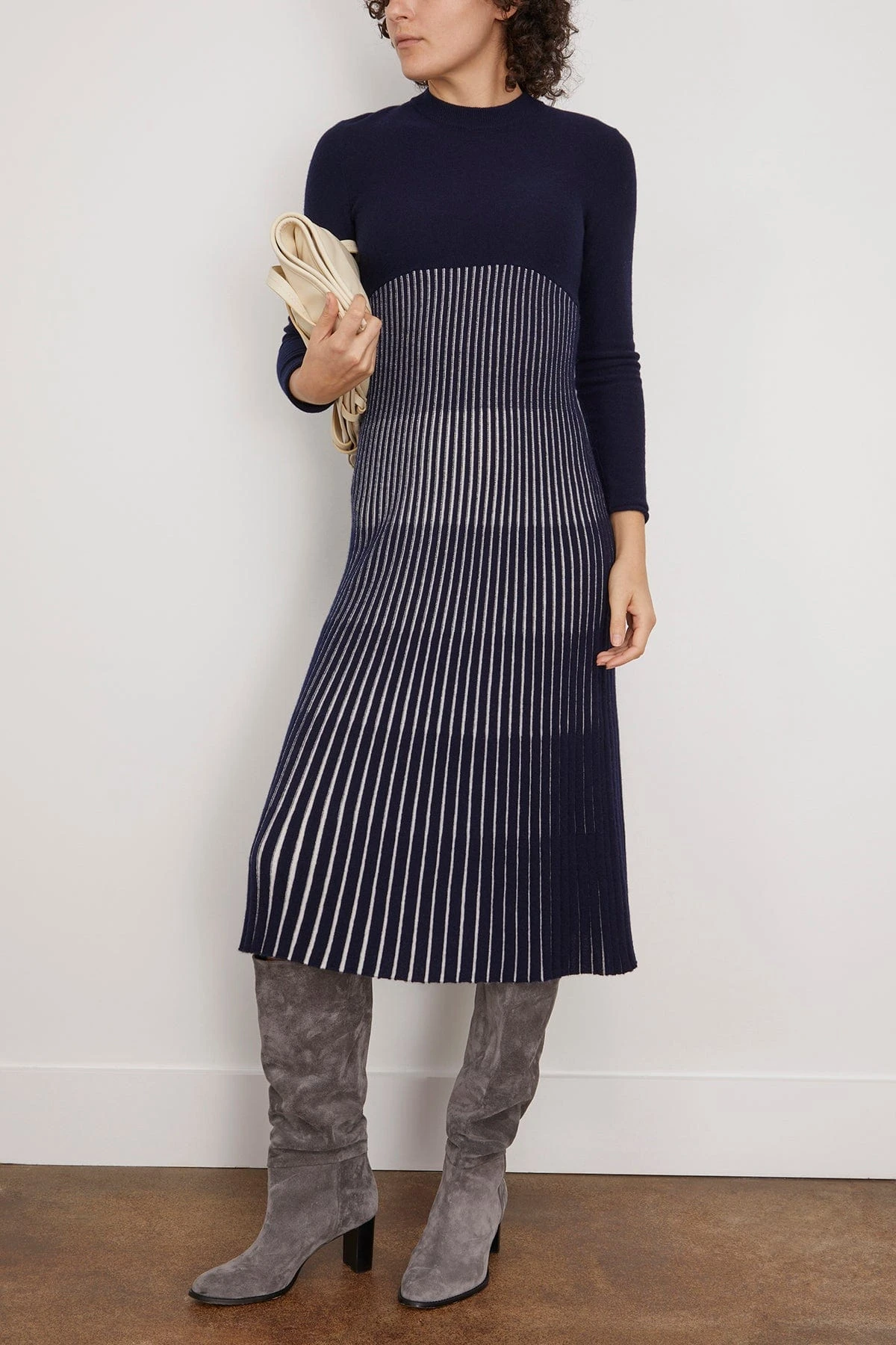 The Lisa Yang Finley Dress is a dimensional midi dress in an A-line silhouette. This navy and cream knit is crafted with pure cashmere and features long, fitted sleeves and a plis pleated skirt. We love it worn with ballet flats and a long coat.