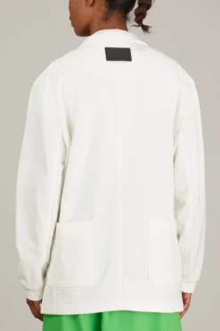 The COG The Big Smoke Gala Tailored Jacket in White is a tailored collared jacket that can be worn like a cardigan. Features ribbed cuffs and collar without lining, patch pockets on the hips. The material is knitted with the world’s first 36-gauge fleece knitting machine and features a firm density and beautiful surface.