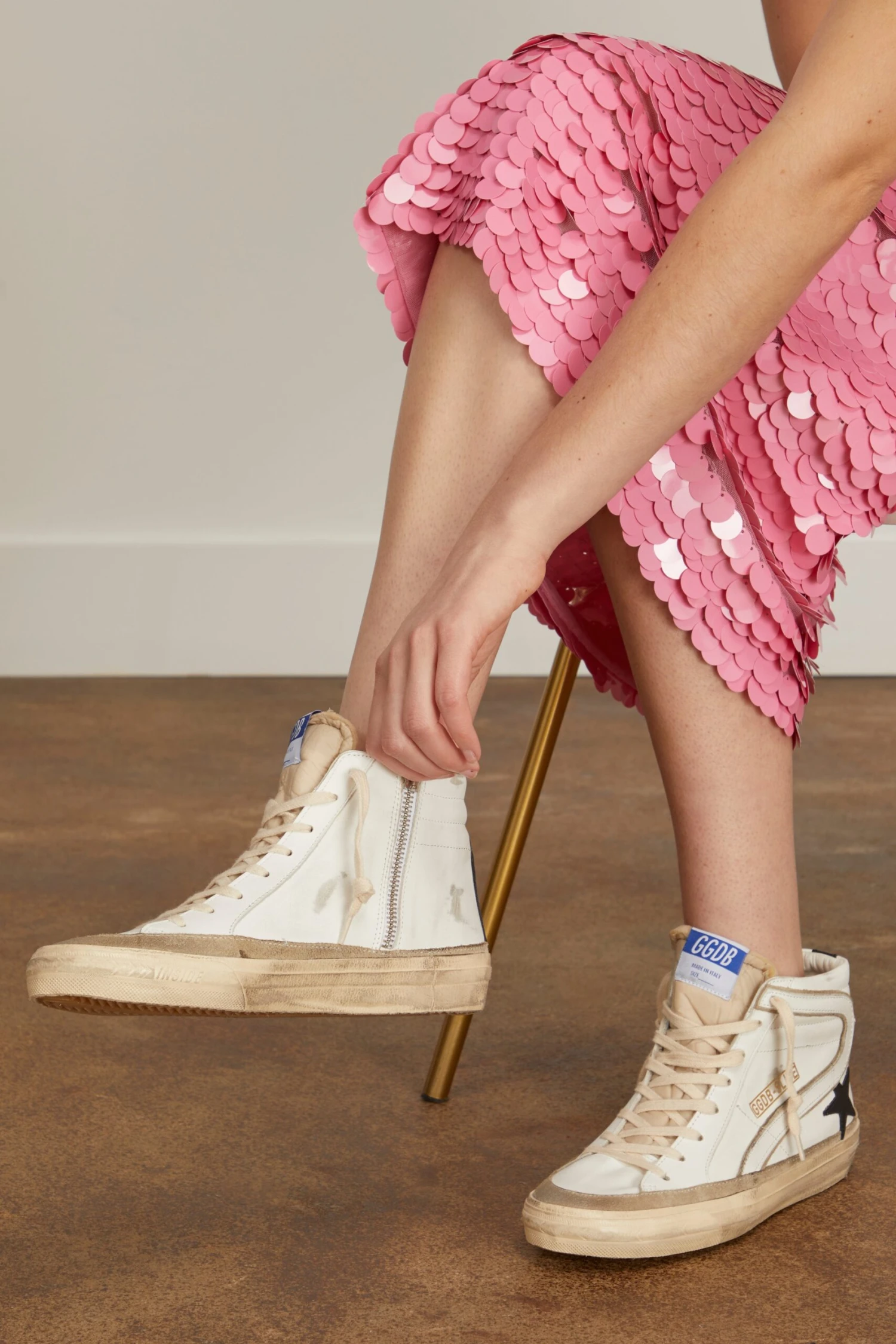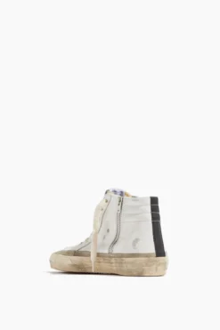 Your favorite high top sneakers are back. The Golden Goose Slide Leather Sneaker feature their signature distressed detailing with a zip side.