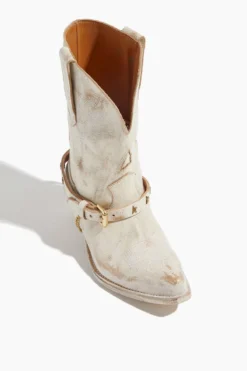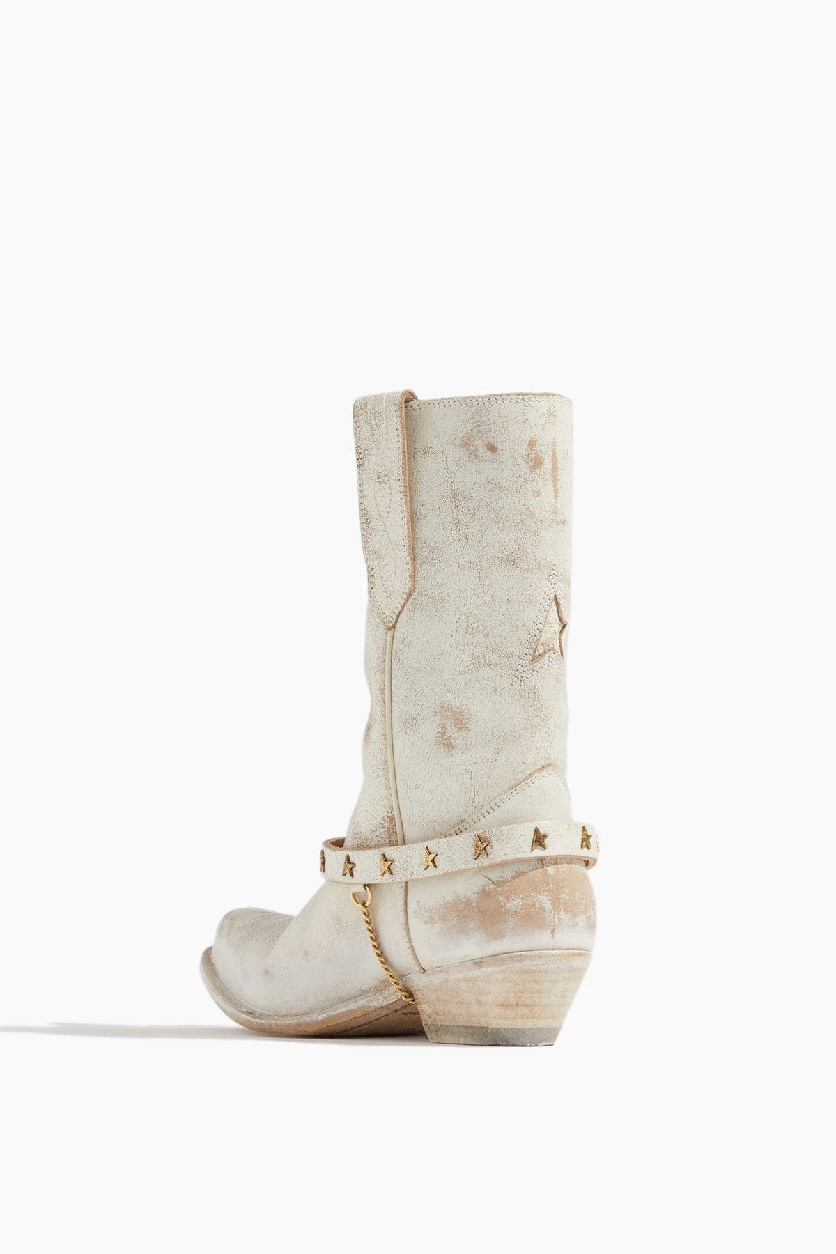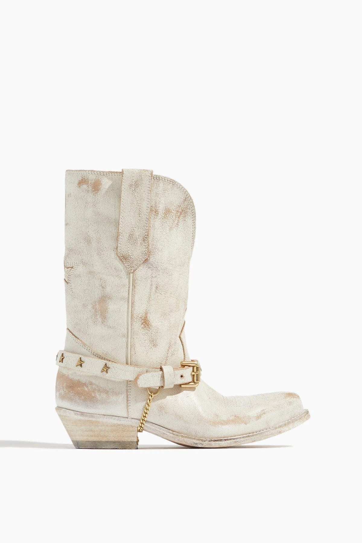 The Golden Goose Wish Star Leather Low Boot are a must-have piece from their Spring 23 Collection. You’ll love the distressed leather of these cowboy boots with galvanic antique gold stars, buckle and chain.