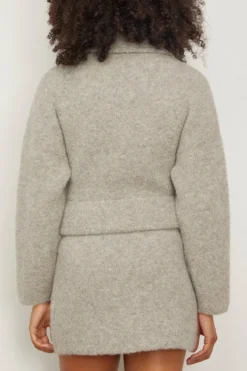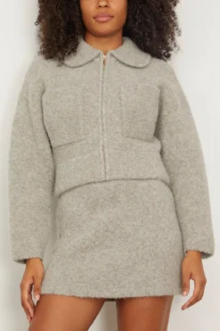 The Clea Hugo Boucle Bomber is a sculptural, modern take on the classic bomber jacket. Crafted from an Alpaca blend boucle yarn with a warm and soft hand feel. This beautiful piece features a rounded collar, patch pockets and rounded sleeve shape. The front is fastened with a heavy gauge metal zipper with bespoke rounded zip puller in soft gold. This piece pairs perfectly with the Chloe Boucle Skirt.