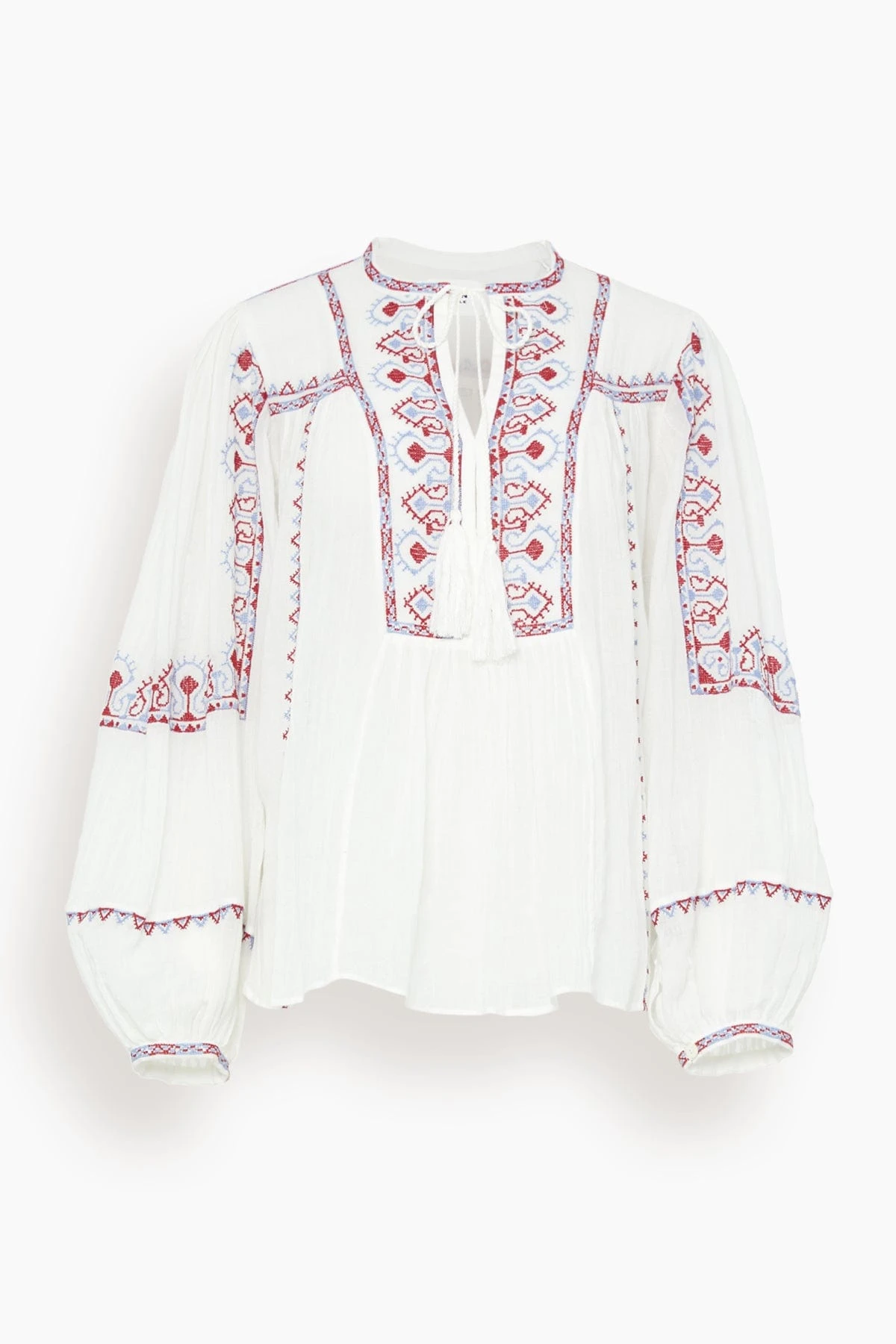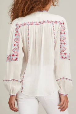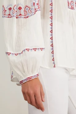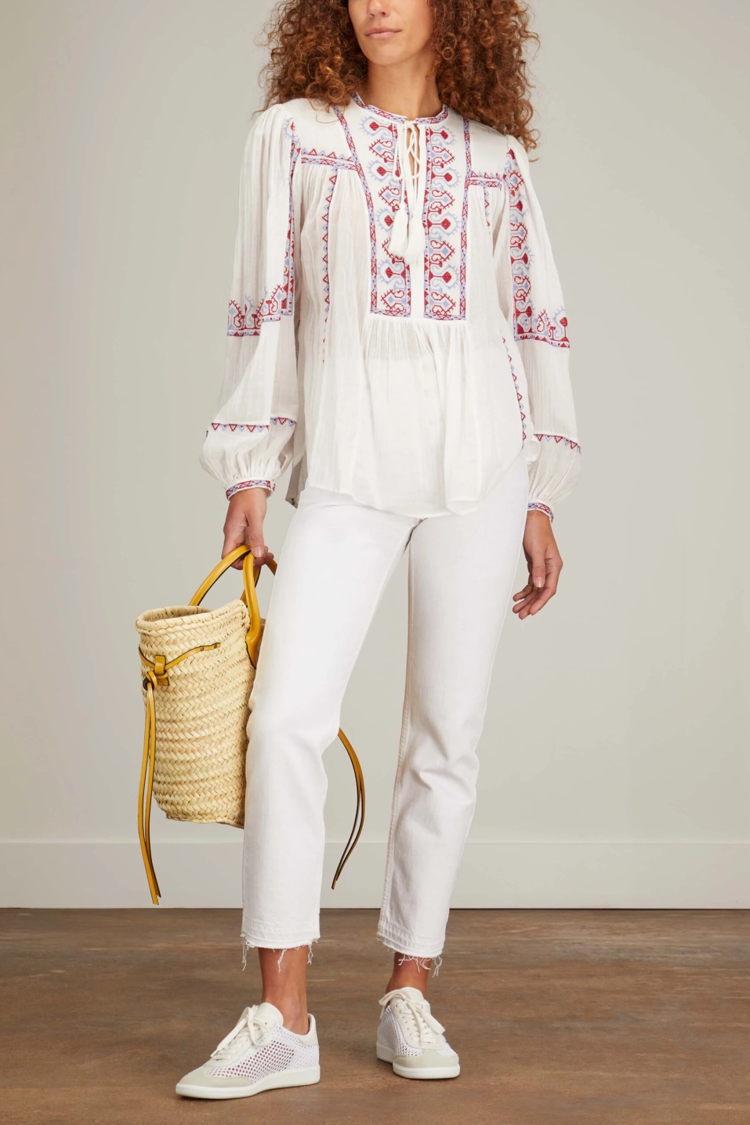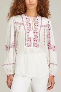 The Isabel Marant Etoile Kiledia Blouse features beautiful embroidery. This blouse has a loose silhouette with blouson sleeves and laces. Wear yours with shorts and sandals.