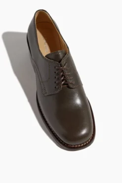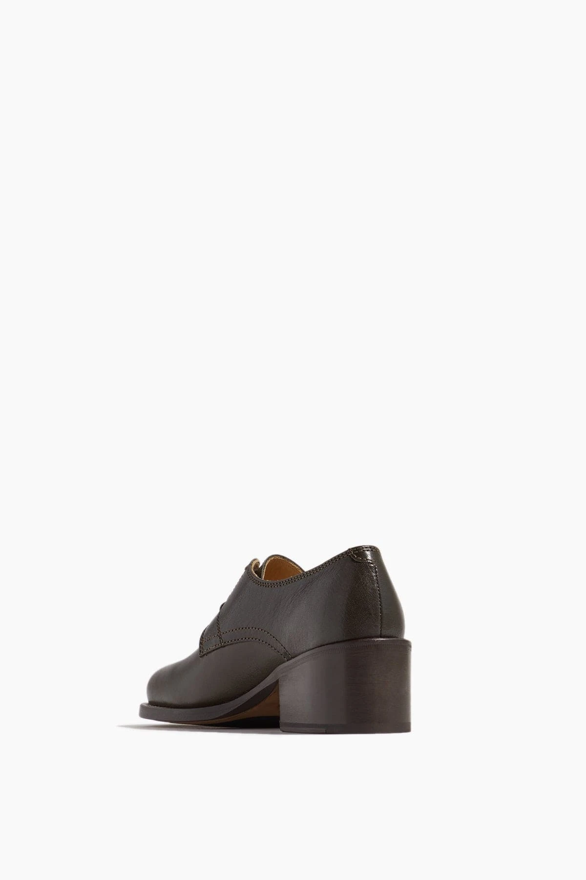The Lemaire Heeled Square Derby in Forest Brown is a vegetable-tanned leather heeled loafer with a compact grain and a smooth finish. A rounded toe, lace up design, and tonal sole complete their practical details.
