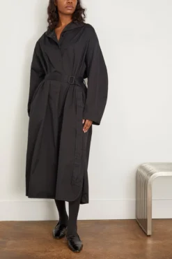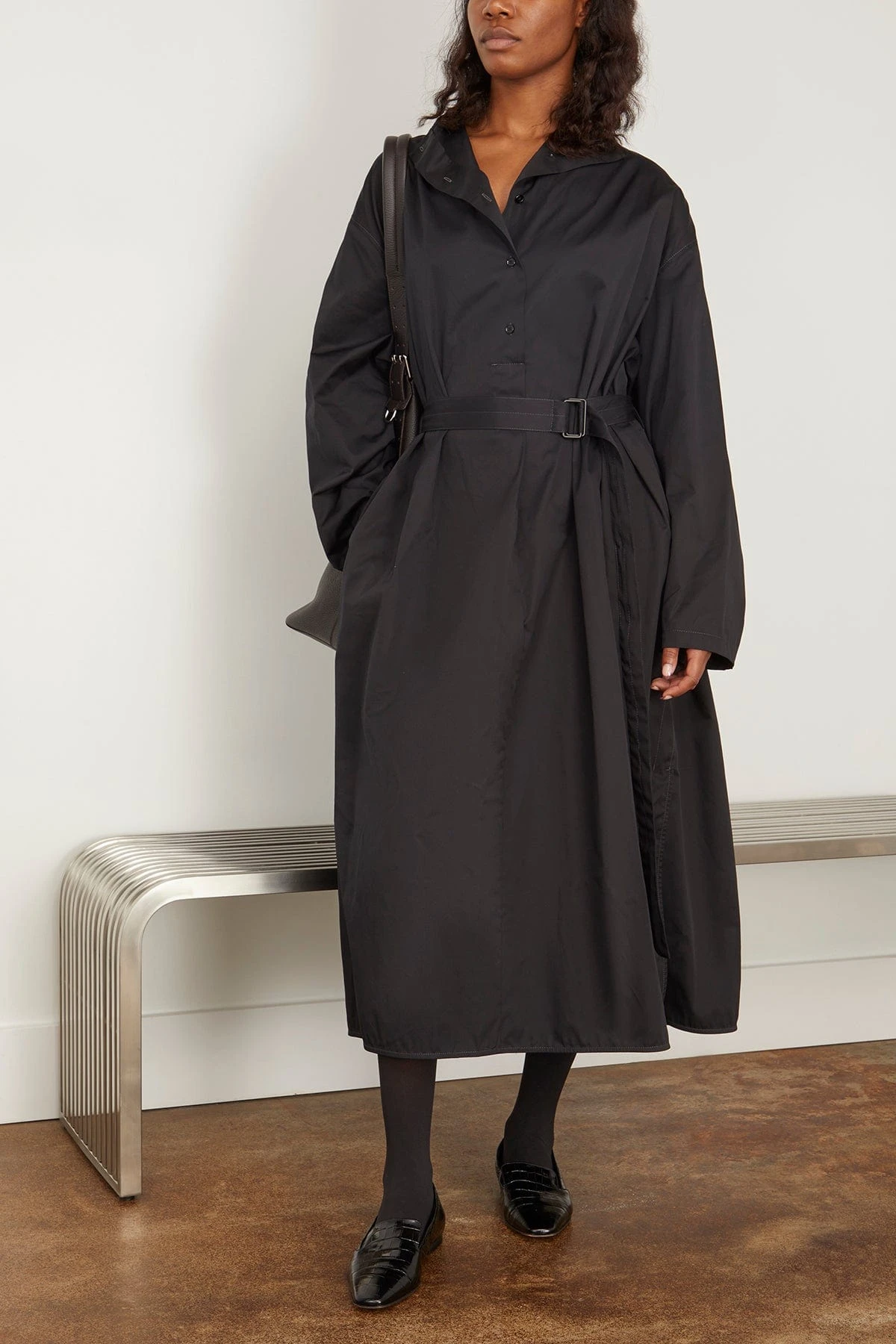 The Lemaire Housse Dress in Black is made of light cotton twill with a soft hand that is slightly shiny and a smooth drape. The silhouette is reminiscent of the rounded curves of a garment bag, draping from the neckline down into round shoulders. Its generous volume can be adjusted using the matching belt and it opens partially down the front with a buttoned french placket, and along the sides with long slits. We love it paired with ballet flats and a mini purse.