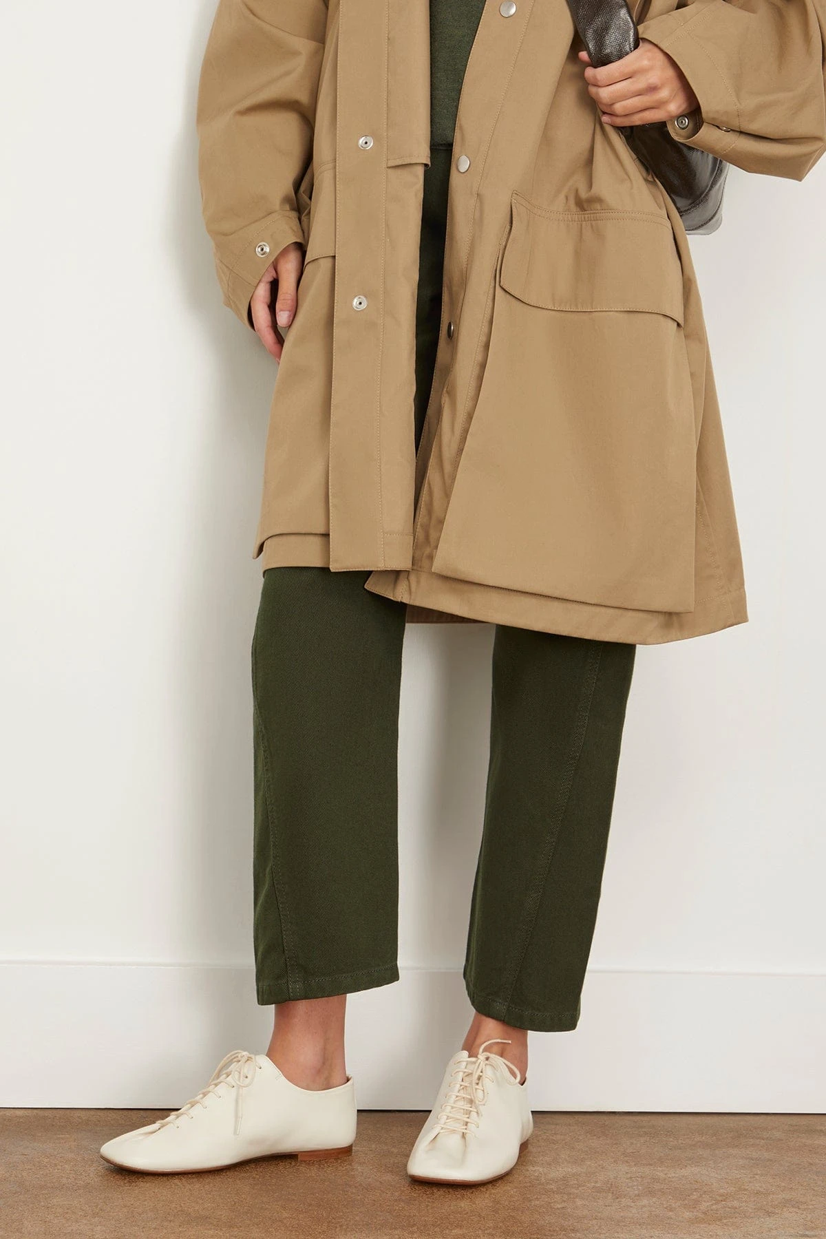 The Lemaire Souris Flat Classic Derbies in White are made of lamb nappa leather with a shiny finish. They include waxed cotton laces, slightly rounded square toes and a flat heel.