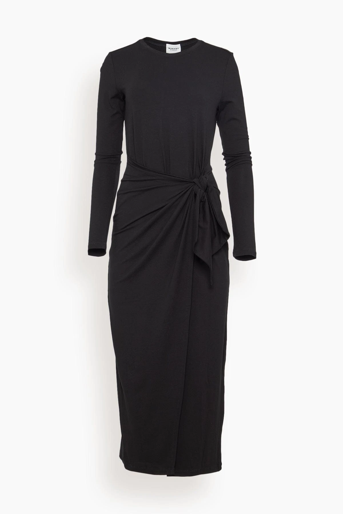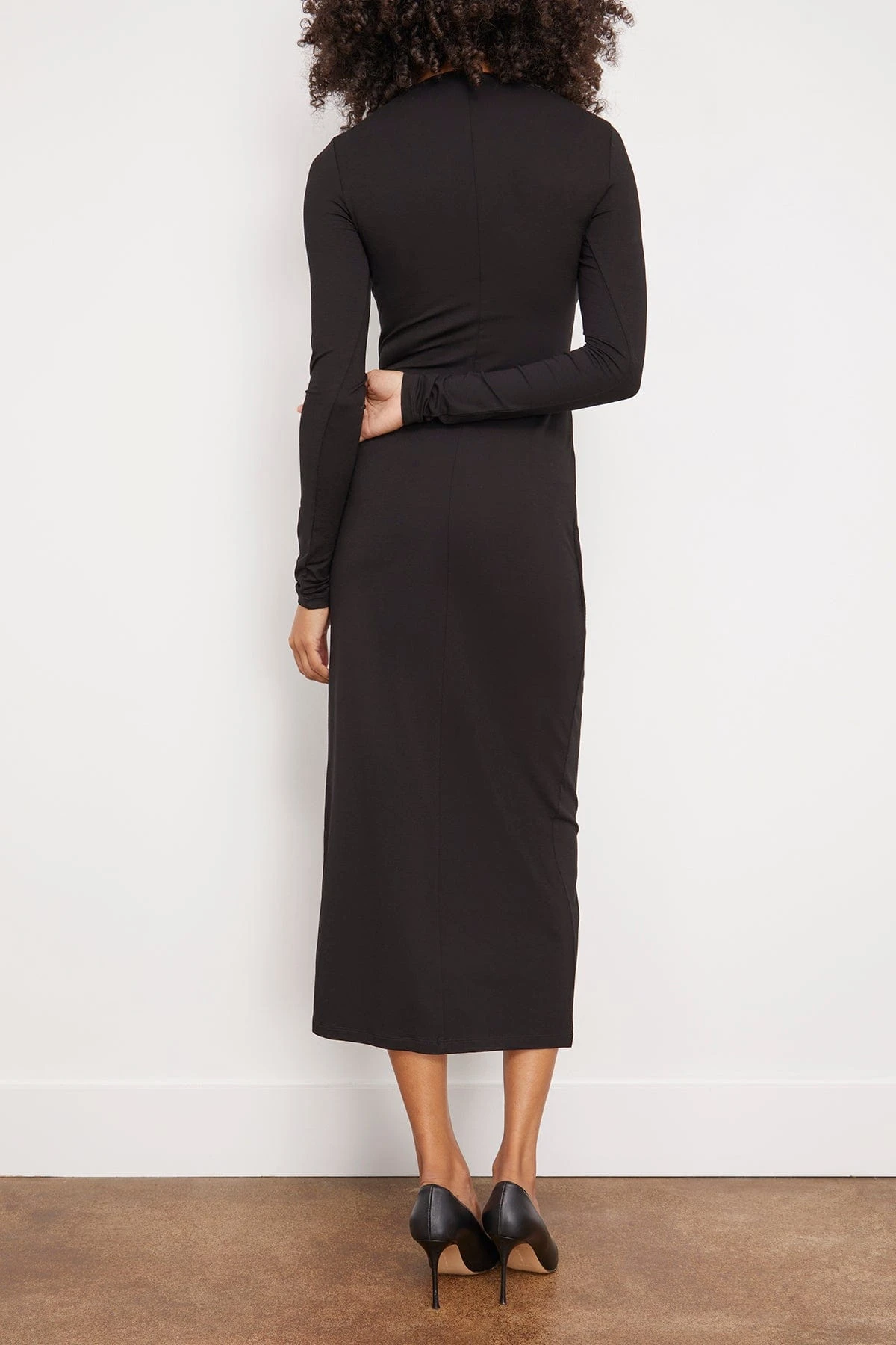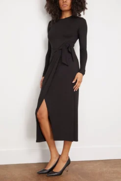 The Isabel Marant Etoile Lisy Dress in Black is a wool midi dress featuring a wrap skirt and side slit hem. We love this classic black dress with heels and a long coat.