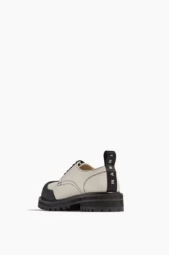 The Marni Dada Derby is crafted of smooth calfskin leather and reinforced with a chunky rubber toe cap with debossed Marni lettering. Branded tape pull tab and leather insole. This Derby shoe is complete with a lightweight yet chunky rubber lug sole.