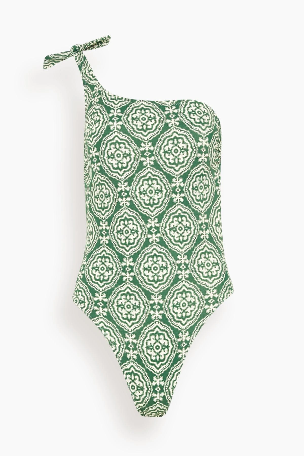 The Lemlem Medallion One Shoulder One Piece takes its inspiration from ancient architectural patterns. You’ll love the bold print of this one piece swimsuit with one shoulder and moderate coverage. Wear yours with the matching skirt by the beach or pool.