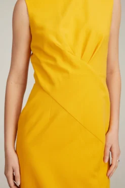 The E. Stott Mila Dress in Ochre is a sleeveless midi dress in cady fabric with a flattering gathered seaming detail at the waist.