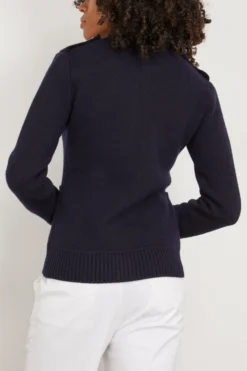 The Nili Lotan Kala Jacket in Dark Navy is somewhere between a sweater and a jacket. This jacket is crafted with a heavyweight knit composed of a merino wool and cashmere blend. It has a slim fit; cozy ribbing at the cuffs, collar, and hem; and military-inspired details, like epaulets and patch pockets. The gold crest buttons read like jewelry, so you can keep yours simple. We love it paired with a pencil skirt and a sling-back heel.