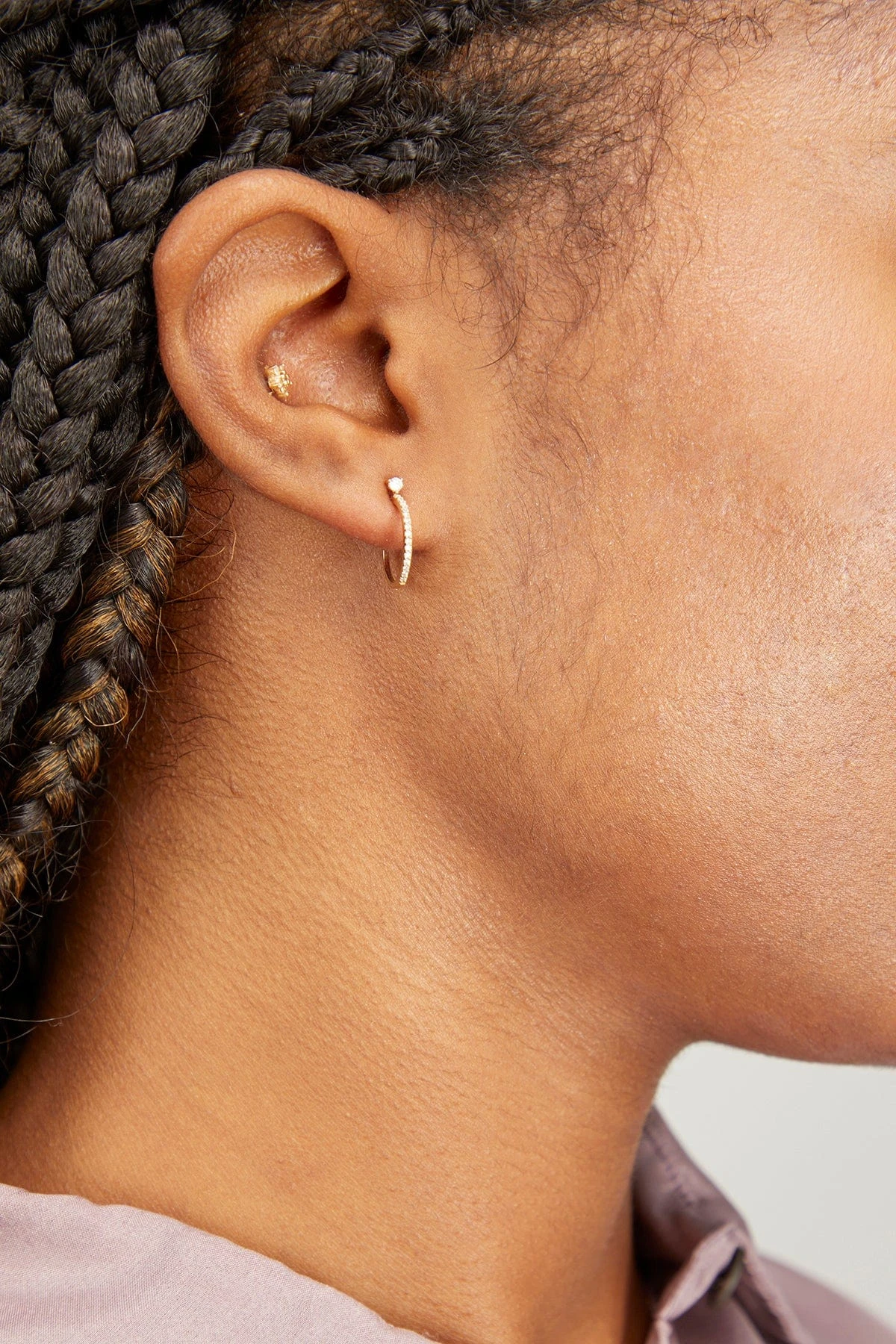 The Pave Diamond J Post Huggies are a subtle yet unique pair of huggies. Pave diamonds outline each huggie.