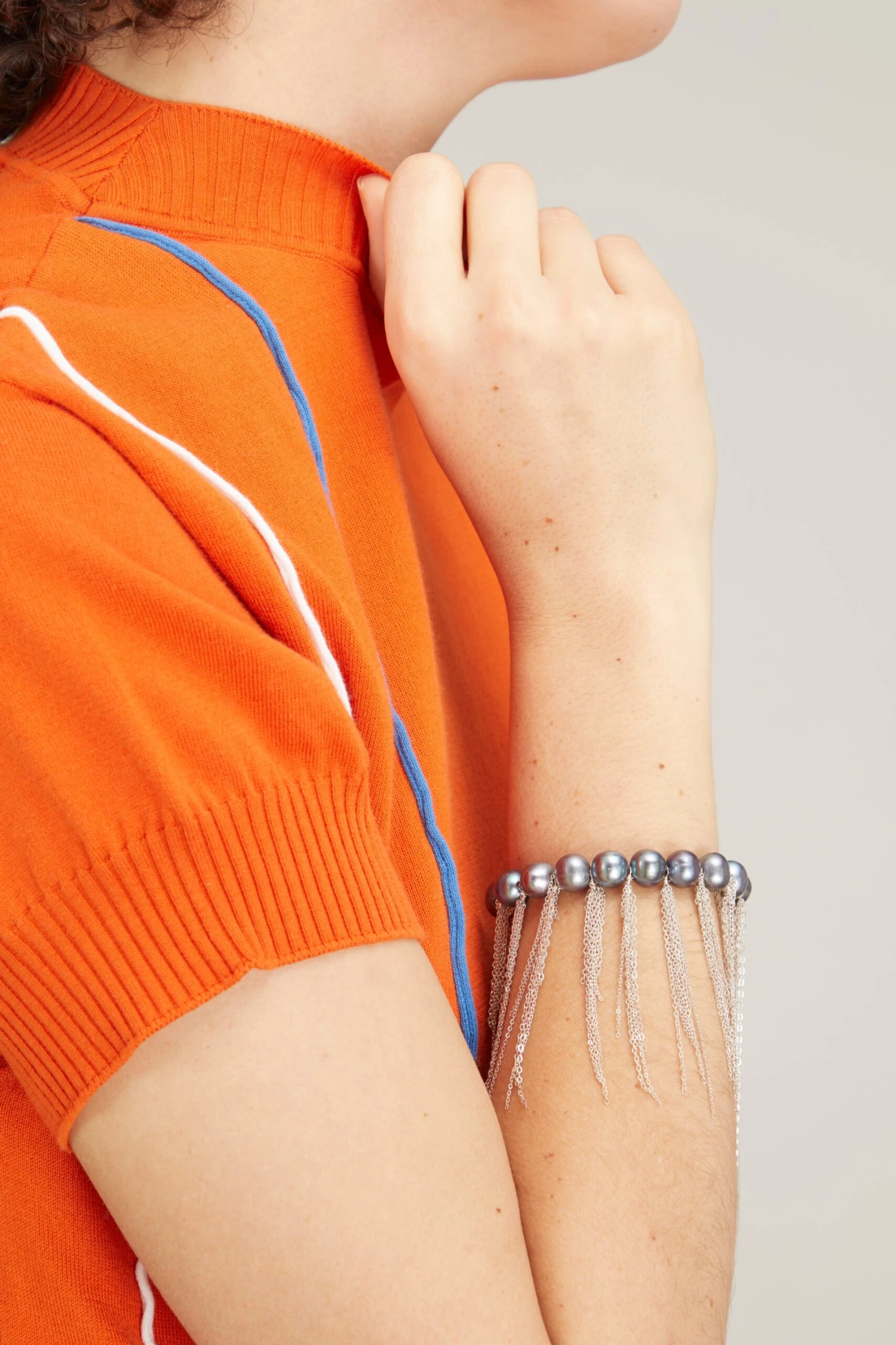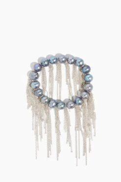 The Samira 13 Peacock Fresh Water Pearl Fringe Bracelet in Sterling Silver is a peacock blue pearl bracelet with silver fringe.