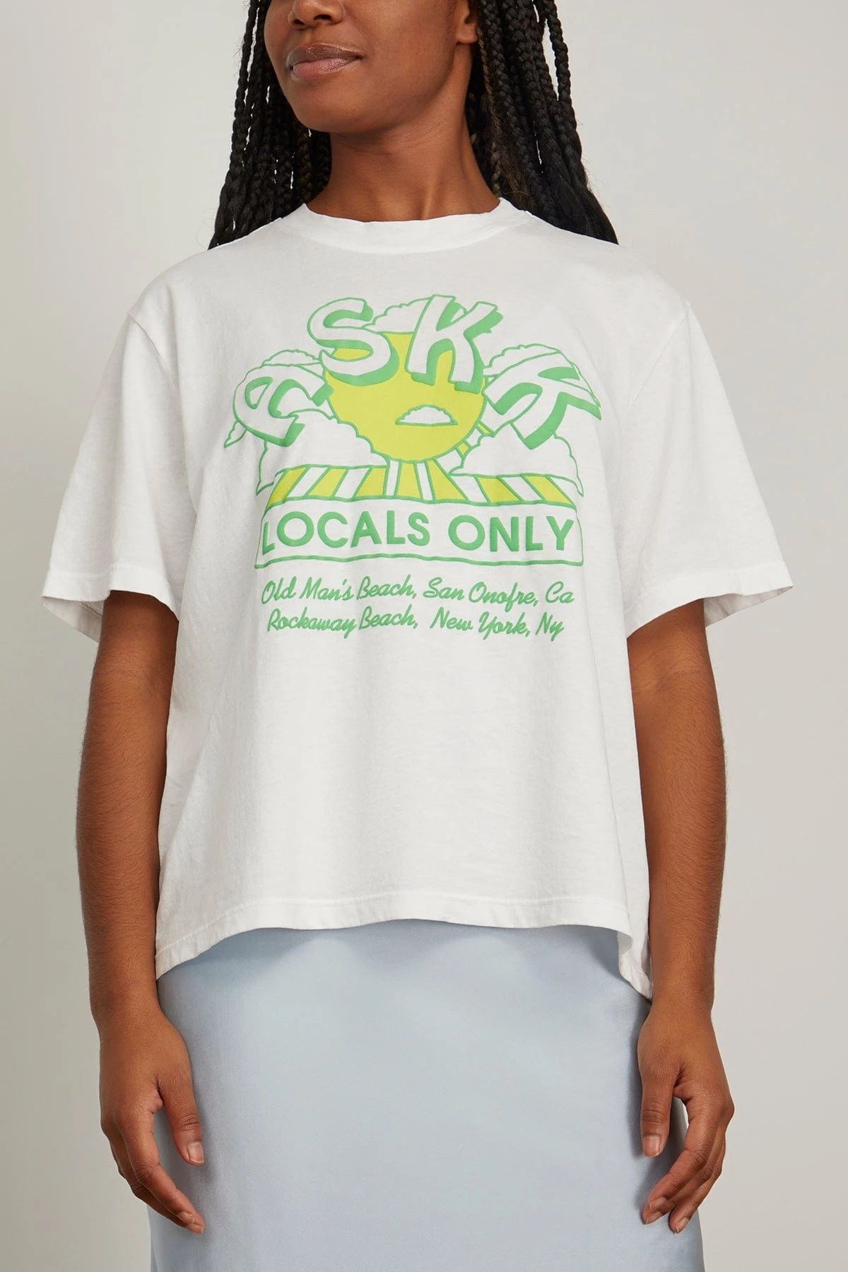 The Askk NY Printed Boy Tee in Sun Print White is a everyone’s favorite oversized tee with a graphic at the chest. We love it paired with jean shorts and sneakers.