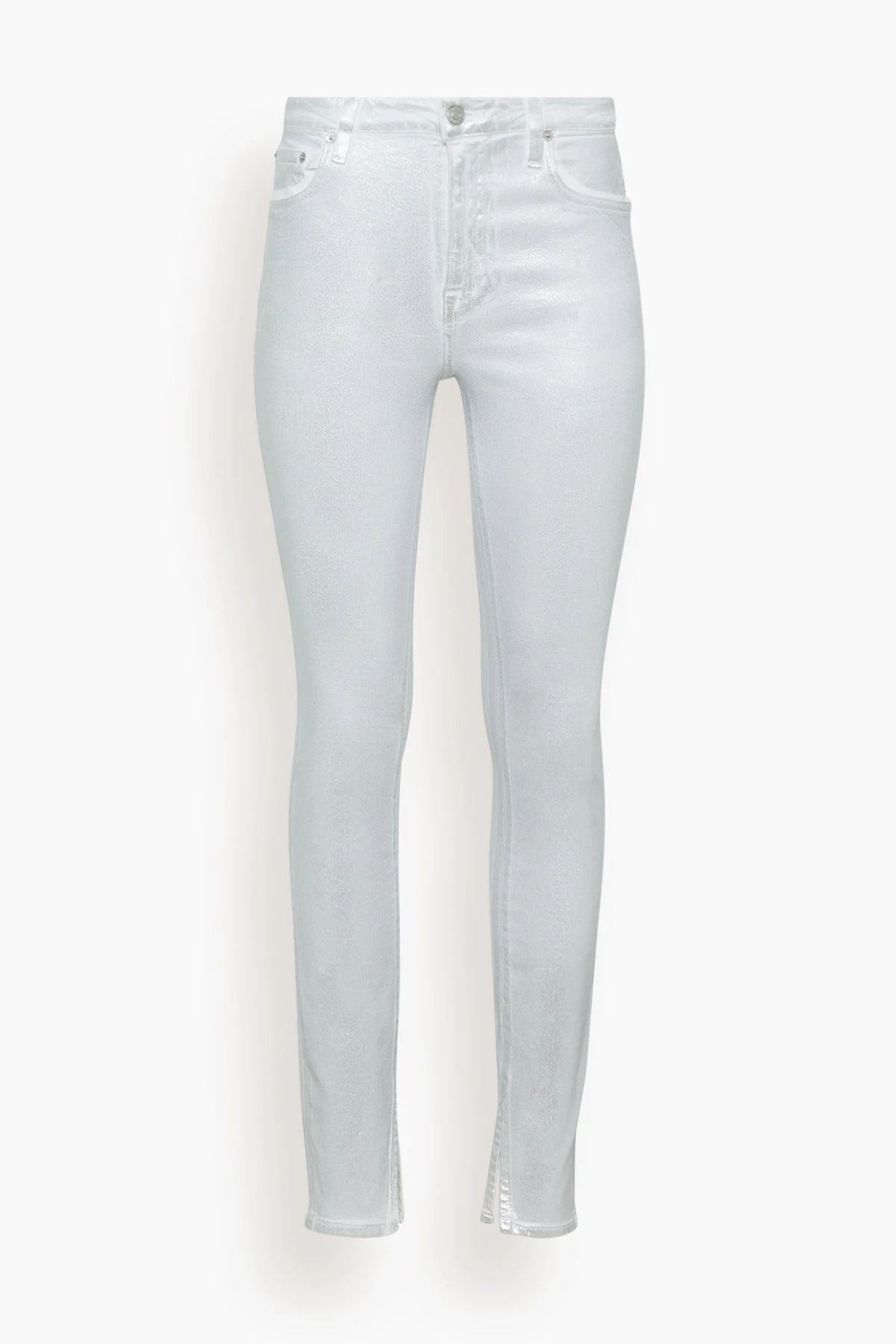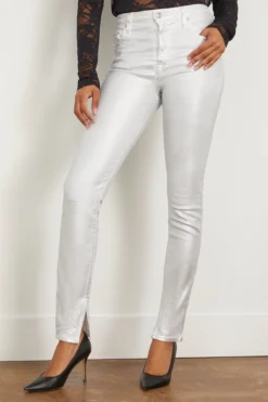 The Simkhai Rae Ankle Skinny Jean is a metallic-coated denim. We love this 5-pocket style with a sweater and sneakers.