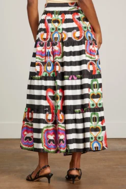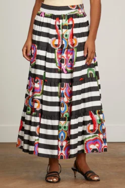 The Rianna & Nina Rosalie Volant Skirt is crafted in a unique bold print. You’ll love the full sihouette of this tiered, a-line skirt in silk. Wear yours witha blouse tucked in.
