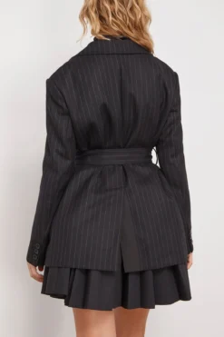 The Sacai Chalk Stripe x Suiting Bonding Jacket in Black features a classic pinstripe fabric with layered design and belted waist. This elevated style of blazer will be a staple in your professional wardrobe. We love it paired with a slim pant and a tote.