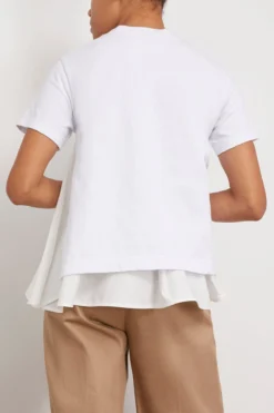 The Sacai Cotton Poplin Mix Cotton Jersey T-Shirt in White features short sleeves with a tiered layered design. This top gives a twist to your classic white tee. We love it with jeans and sneakers for an on-the-go look.