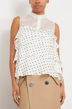 The Sacai Polka Dot Flock Print Pullover in Off White features a sleeveless design with polka dot print and tiered silhouette. We love this top worn with jeans and heels.