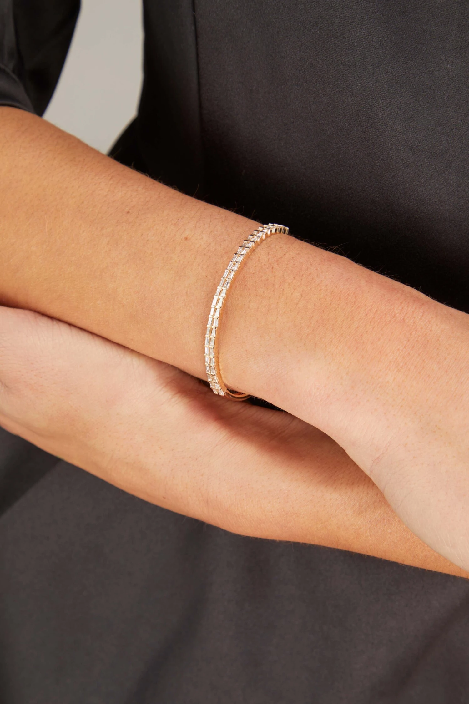 Take the guesswork out of bracelet stacking with this stunning baguette diamond double cuff. With well over a carat of baguette diamonds, the Sadie Pearl Tapered Baguette Double Row Cuff delights alone or worn stacked. Featuring two styles of baguette diamonds, straight and tapered, this modern diamond cuff bracelet is classic enough to pair with any outfit but unique enough to stop people in their tracks. Baguette diamonds are famous for their hall-of-mirrors sparkle and are perfect for mixing with your classic round brilliant pieces.