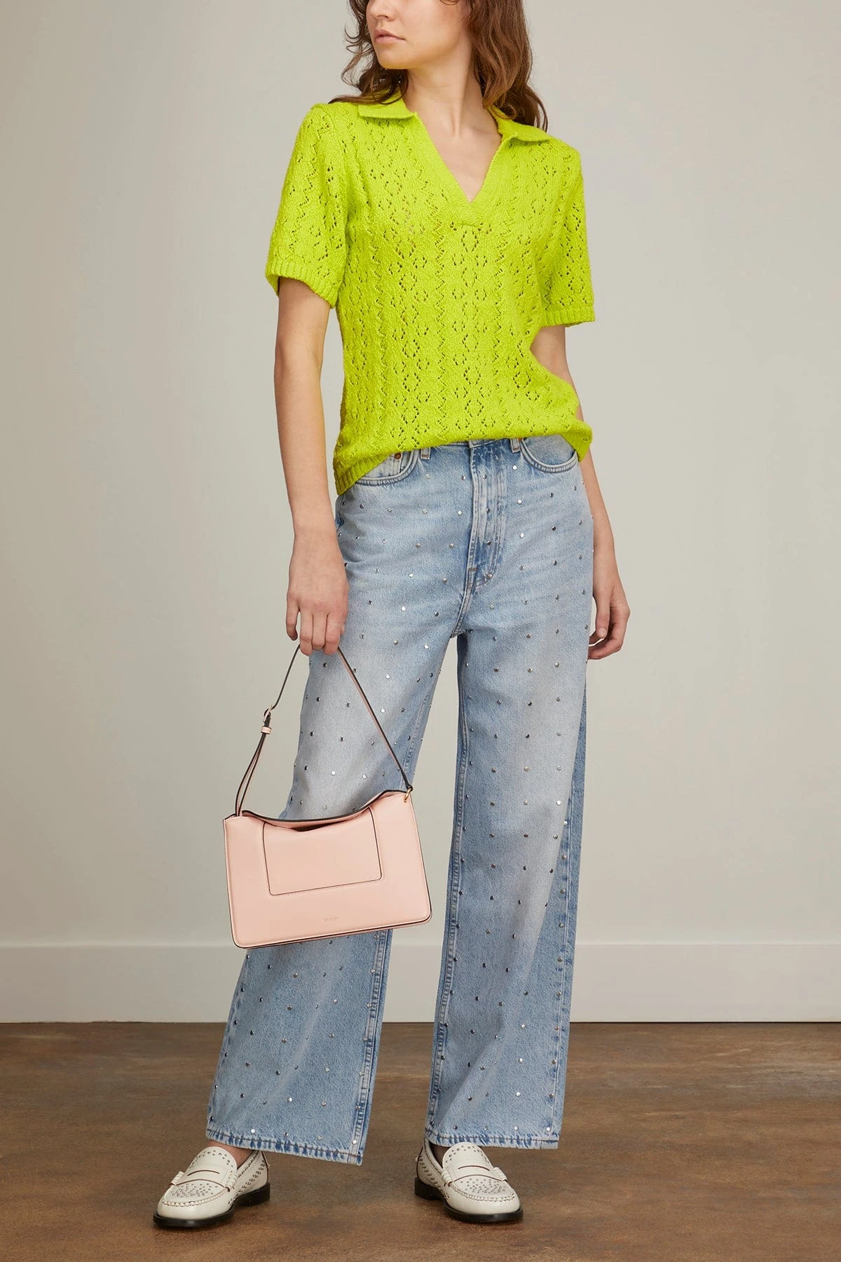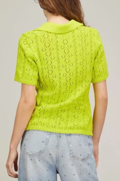 Regular fitting knitted polo neck jumper with short sleeves. Open neck placket with collar. Pointelle lace stitch pattern, organic cotton and recycled cotton blend textured yarn. This product contains organic cotton grown without the use of GMOs or hazardous chemicals and recycled cotton derived from pre- and post consumer waste.