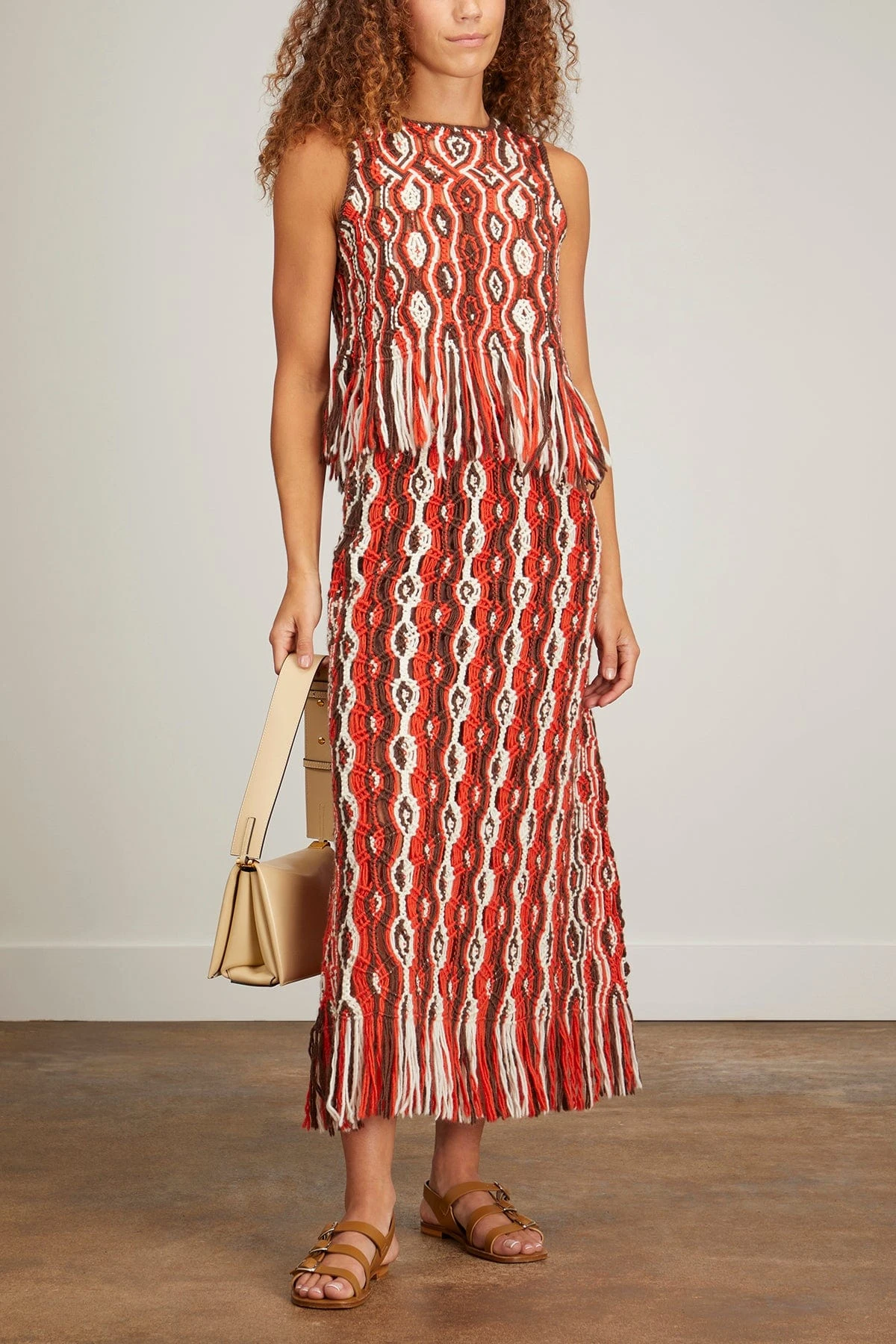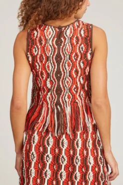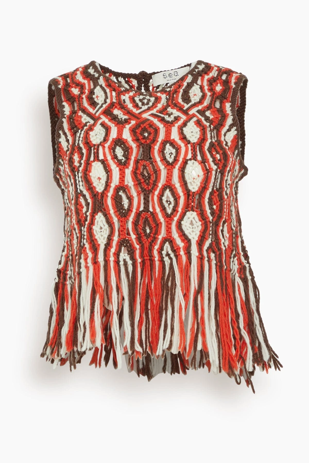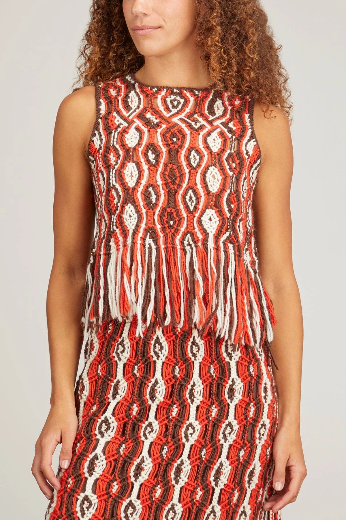 The Drew hand crochet macram knit top features a multi colored knit pattern and fringe hemline.