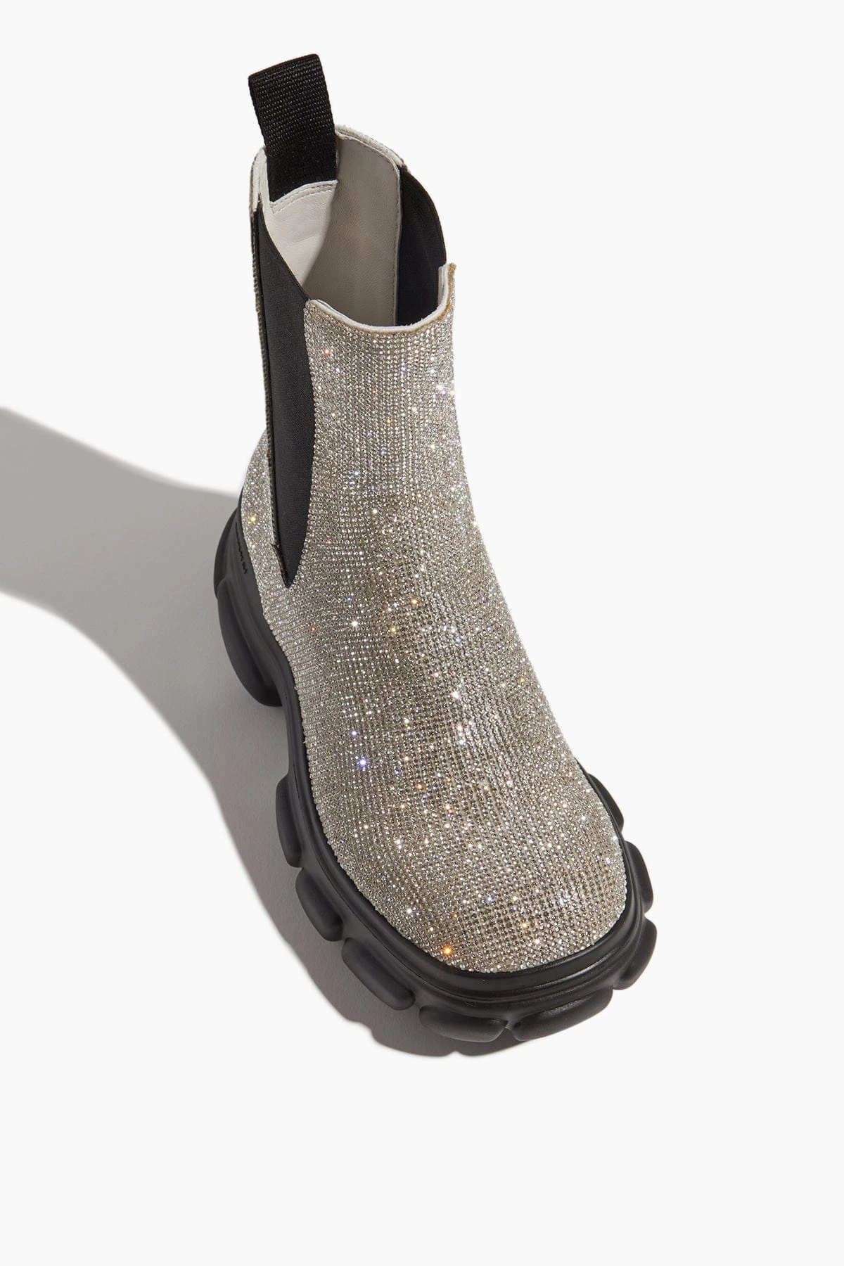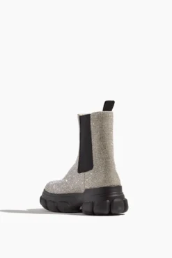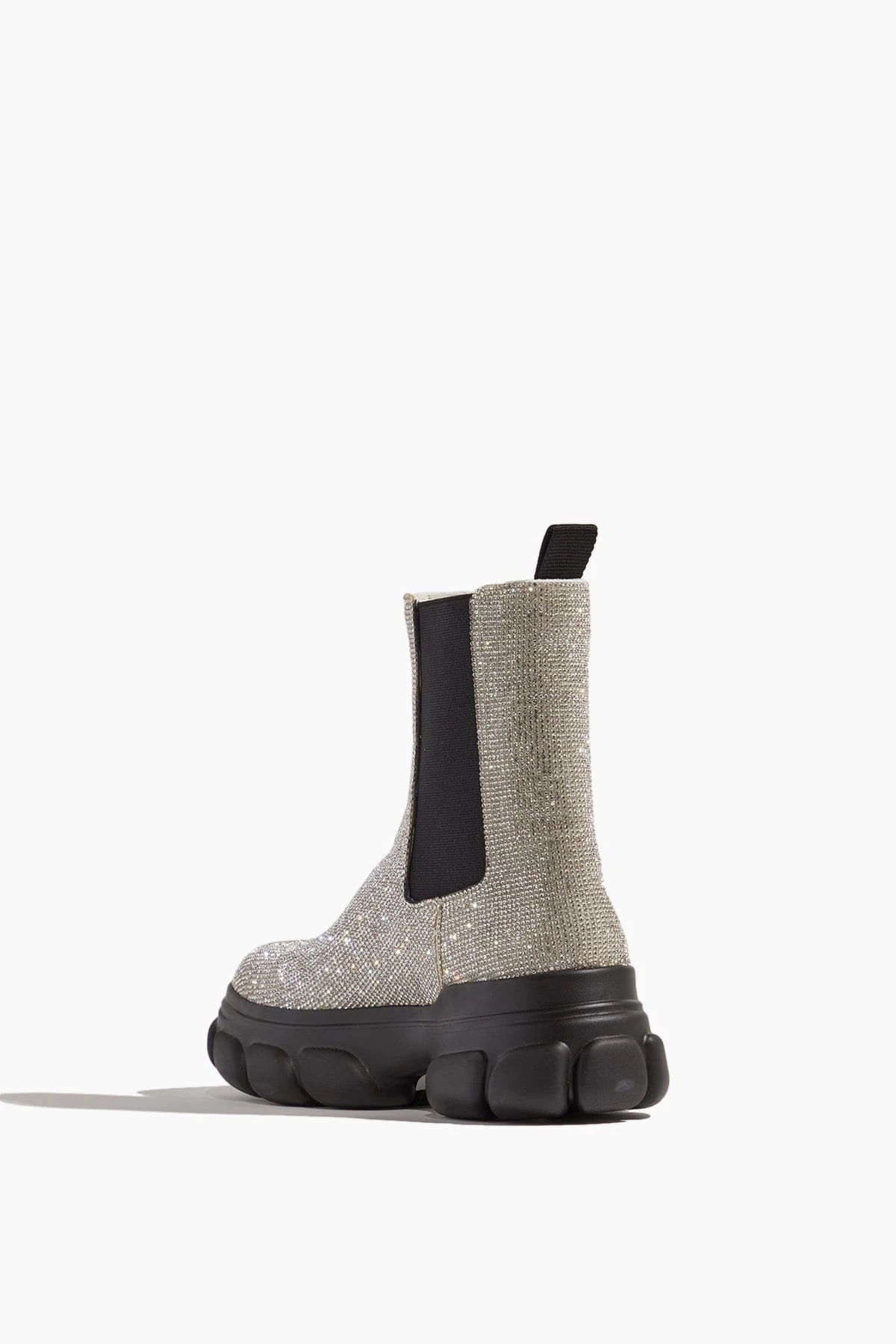 The Simkhai Sid Crystal Lug Sole Boot in Clear is crafted of glass crystals. These Chelsea boots feature a round toe, leather lining, and a 63mm rubber lug sole.