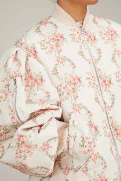 The Simone Rocha Oversized Puff Sleeve Bomber Jacket walked their Spring 23 Runway. This puff bomber jacket features their signature oversized silhouette in their must-have floral print. Wear yours over a dress with loafers.