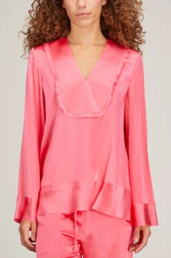 The Lee Mathews Stella Long Sleeve Blouse has a relaxed fit you’ll love. This silk blouse has a v-neckline and flared sleeves with hem detailing. Wear yours with the matching silk trousers.