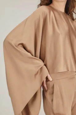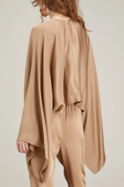 The Stella McCartney Top in Taupe walked their Spring 23 Runway. This cape style top features beautiful draping and a curved hemline in in satin. Wear yours with a skirt and heels.