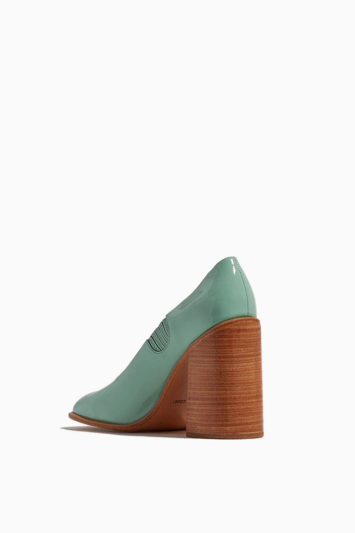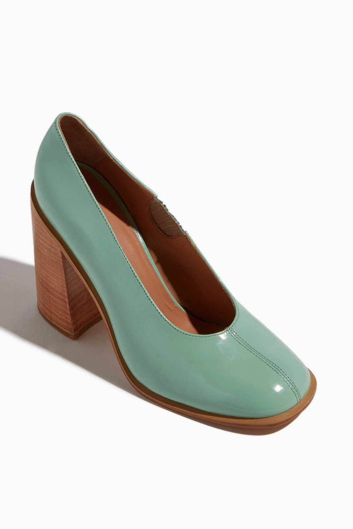 The Rachel Comey Sugar Pump are a playful take on a classic heel. You’ll love the block heel and green crinkled patent leather of these heels with a rounded toe.
