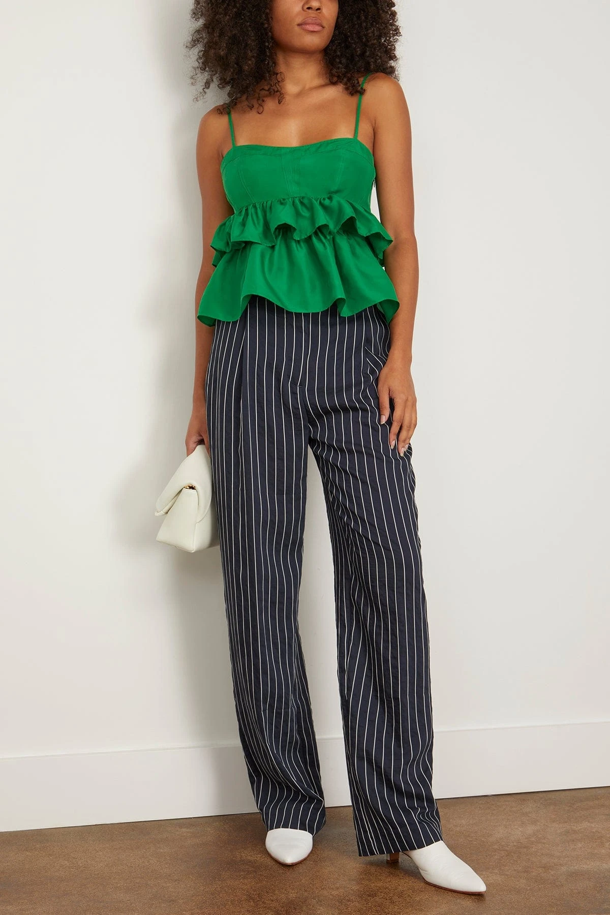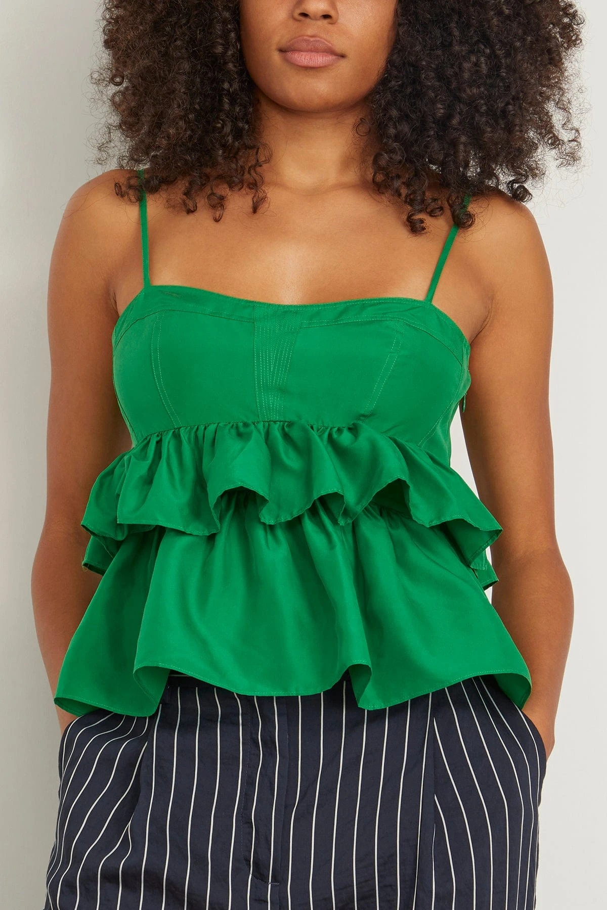The Ulla Johnson Amrita Top in Emerald is a silk top in a vibrant emerald green hue. This sleeveless top features spaghetti straps, an empire waist, and ruffles that create beautiful volume. It is finished with delicate ties that fasten at the back. We love it paired with wide leg jeans and flats.