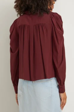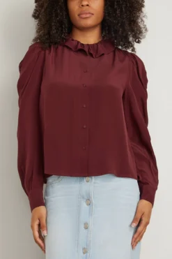 A signature Ulla Johnson silhouette, the Ulla Johnson Dara Blouse in Mahogany is made from our luxurious silk crepe de chine in a soft maroon hue. This elegant blouse features puff sleeves and ruffles that spill out across the high neck. It is finished with a center-front button closure. We love it paired with jeans and a tote.
