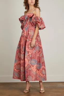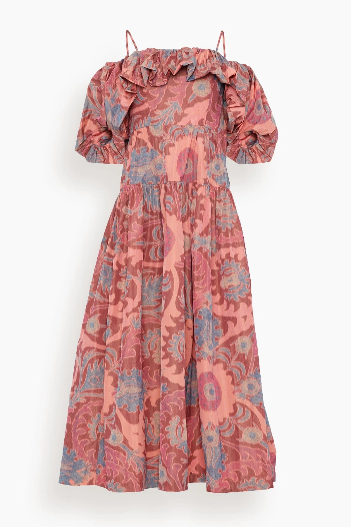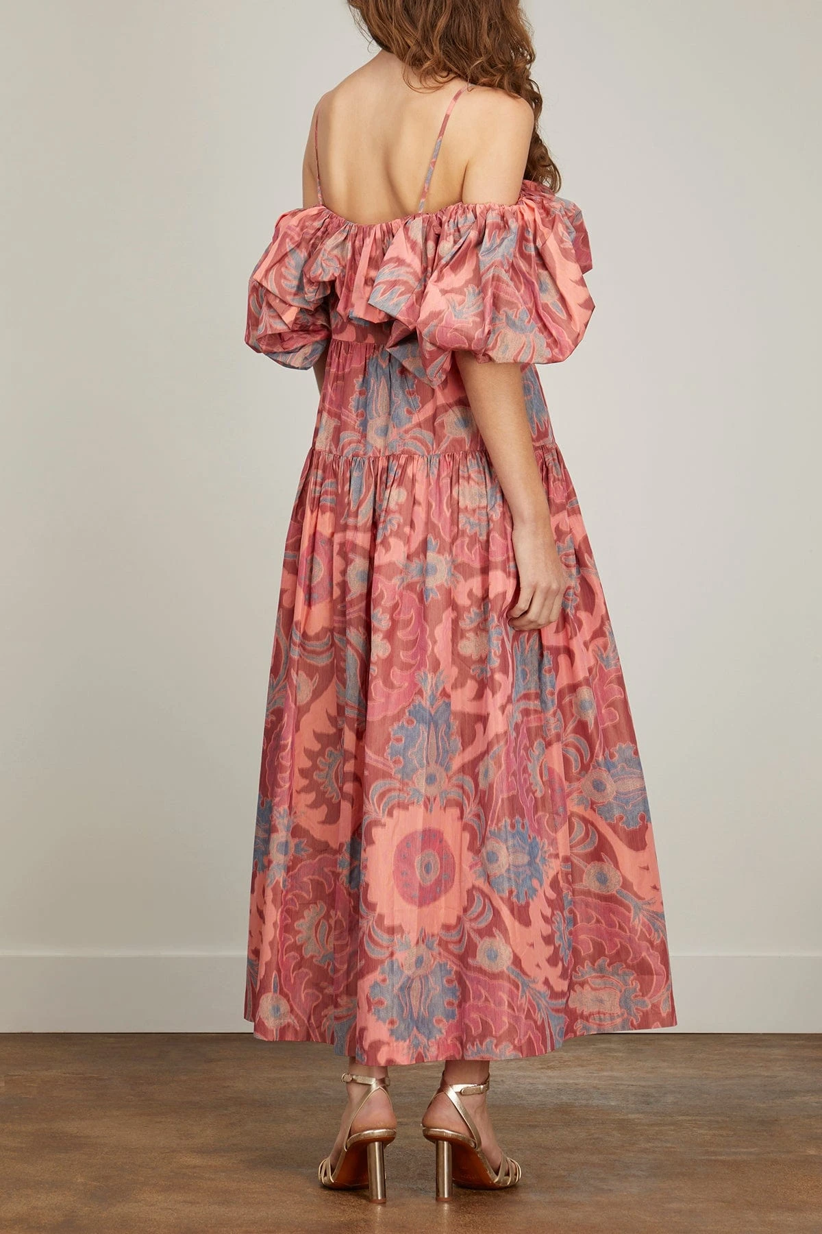 The Izra Gown is crafted from Ulla Johnson’s warp printed taffeta using a technique in which yarns are printed before being woven together, producing a watercolor effect where the print’s pale pink and light blue hues appear to melt into one another. This beautiful full-length dress has bubbled puff sleeves, an off-the-shoulder neckline, and delicate spaghetti straps. It features a corset-style bodice with light boning, a full gathered skirt, and side-seam pockets. The gown is finished with a side-seam zipper closure.