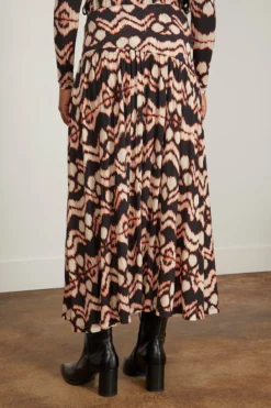 The Ulla Johnson signature tricot jersey returns for Autumn/Winter 23 in a gorgeous painted ikat motif. This midi-length skirt features a vibrant cream and black colorway and has light gathers that create beautiful volume. We love it paired with the matching top and boots.