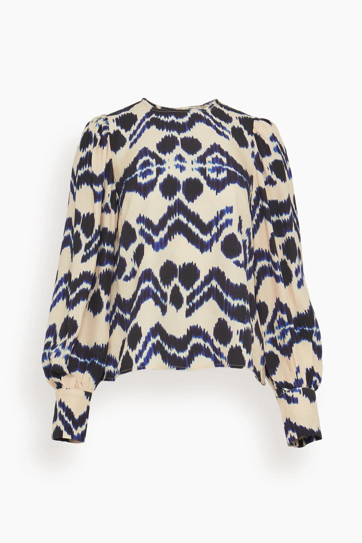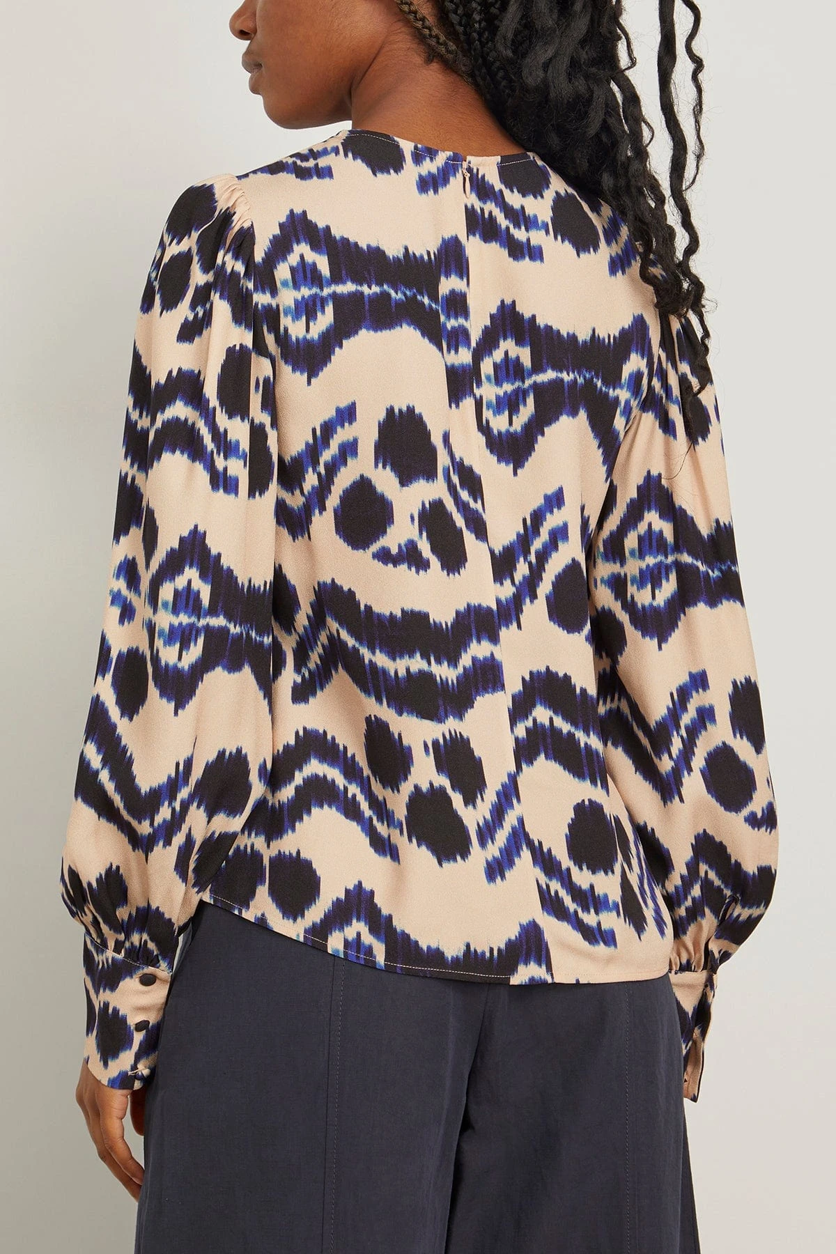 The Ulla Johnson Lilliana Blouse is made from luxurious satin back crepe which features a beautiful, flowing drape. This vivid blue and peach blouse has an airy bodice and voluminous sleeves finished with buttoned cuffs. We love it paired with shorts and tall boots.