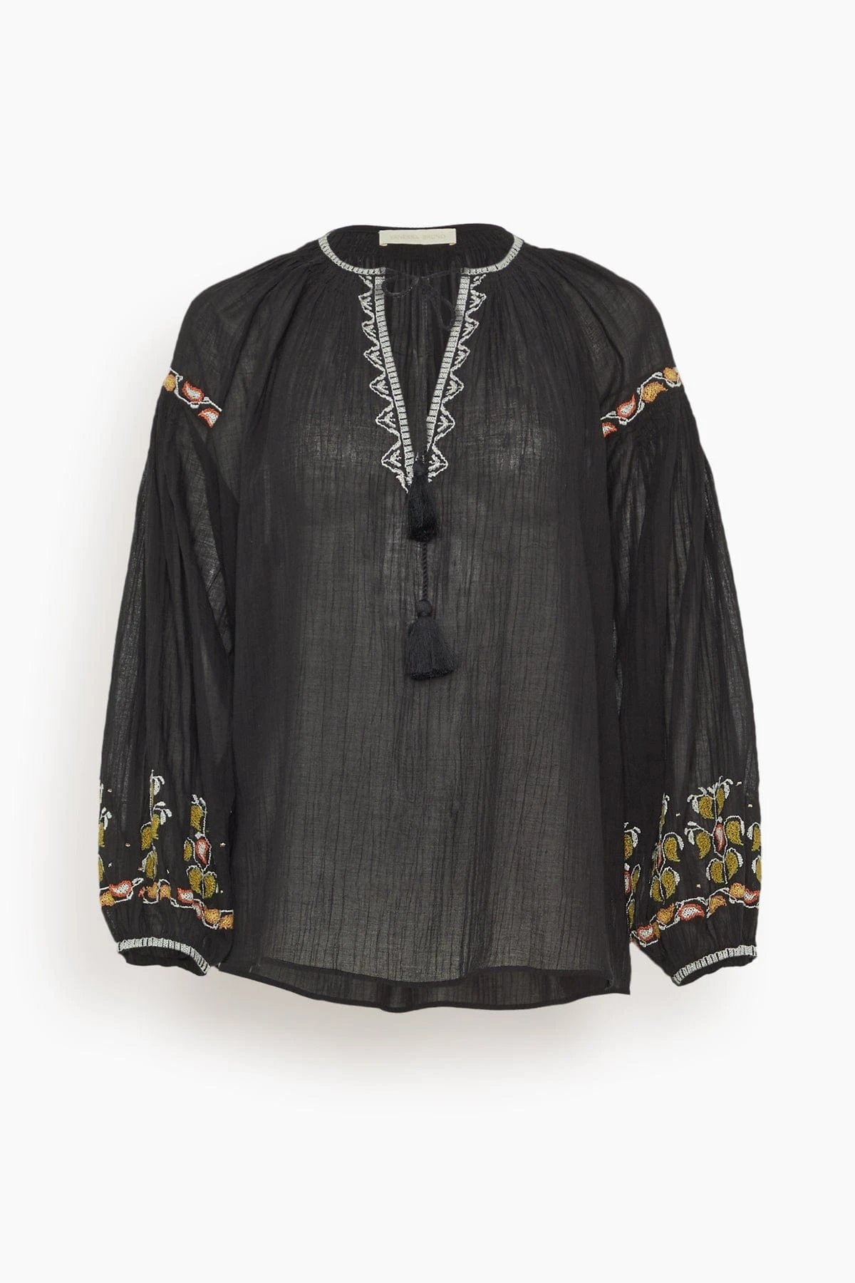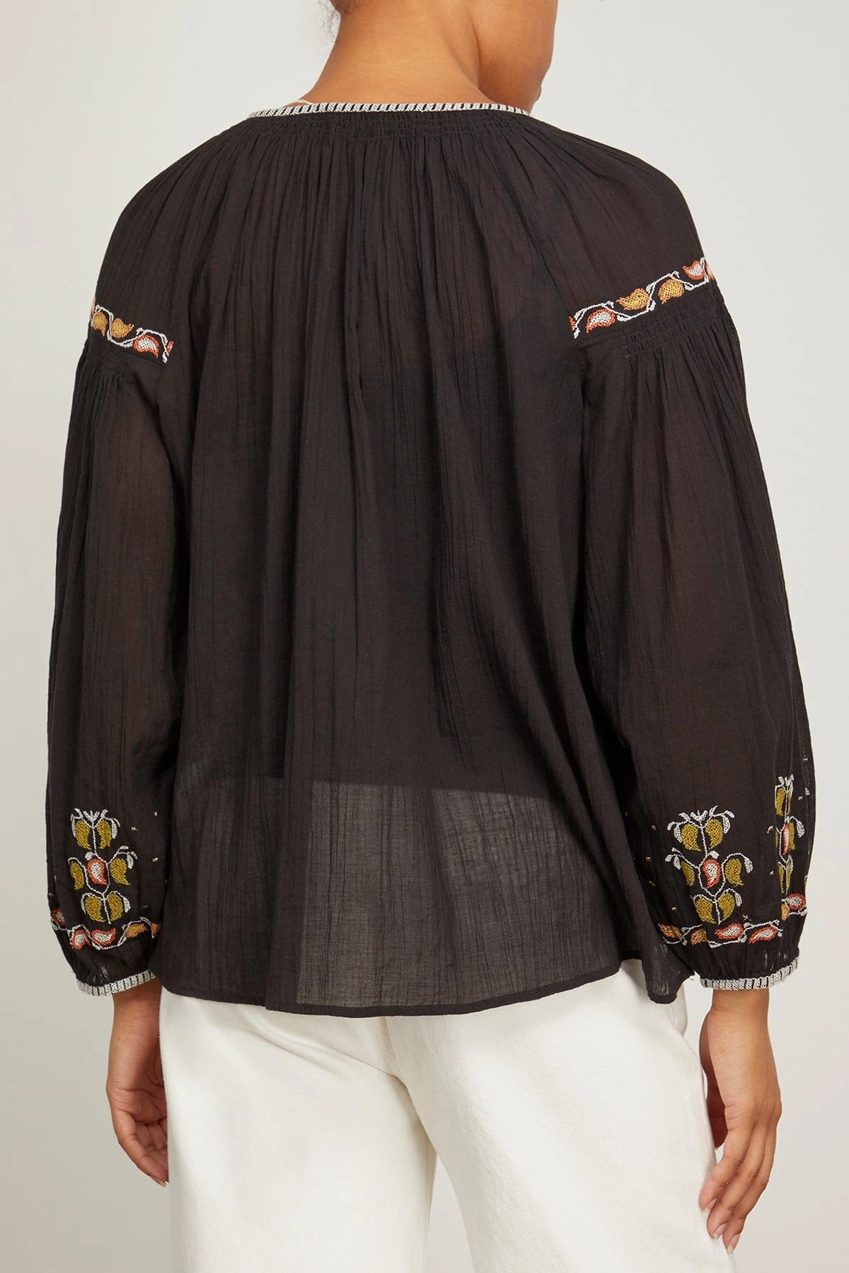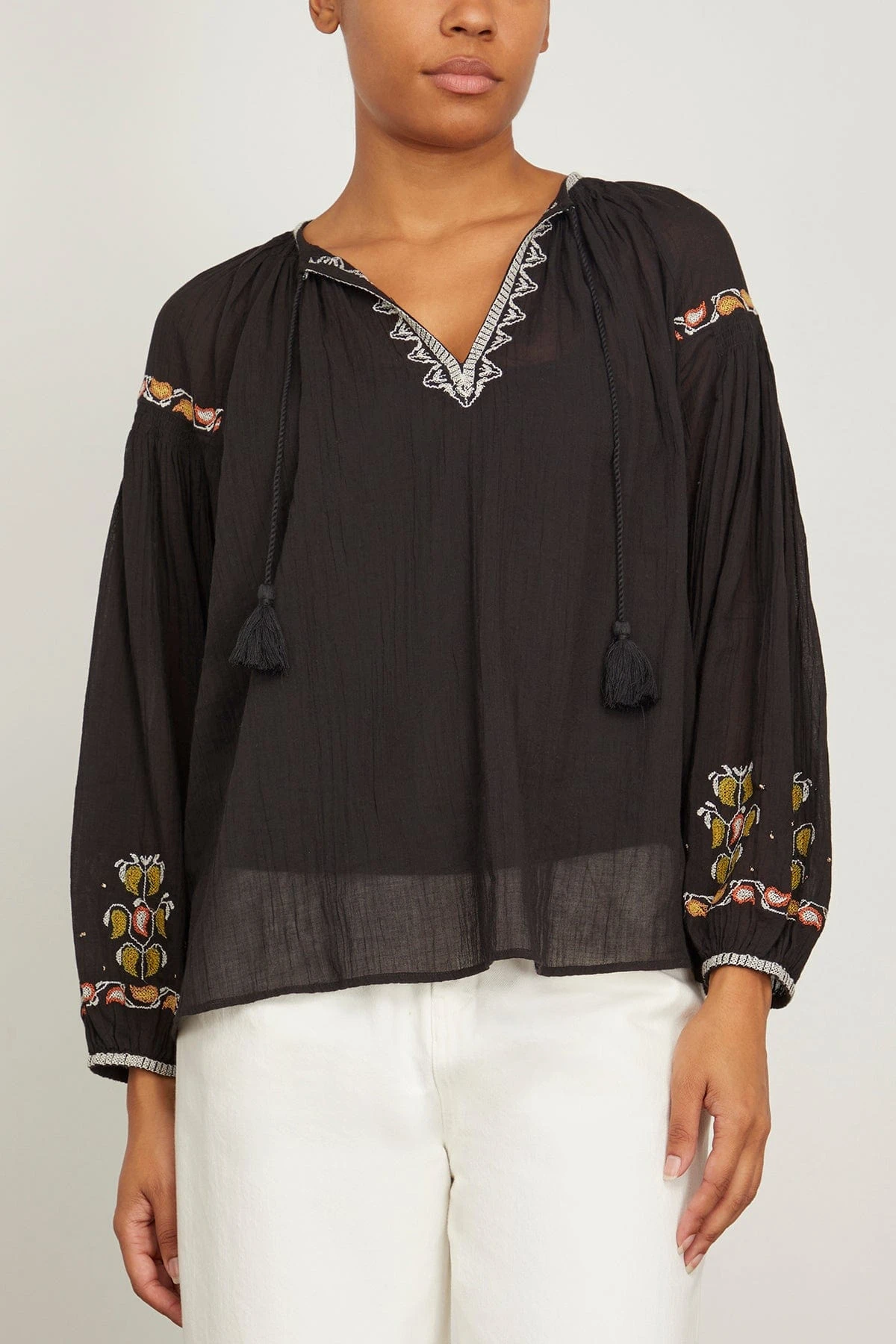 The Vanessa Bruno Bambi Top features the bohemian flare you love from this designer. This crepe blouse has beautiful embroidery along with neckline and sleeves with a loose silhouette and tie neck detail. Wear yours with jeans and sandals.