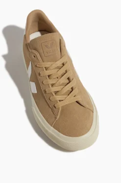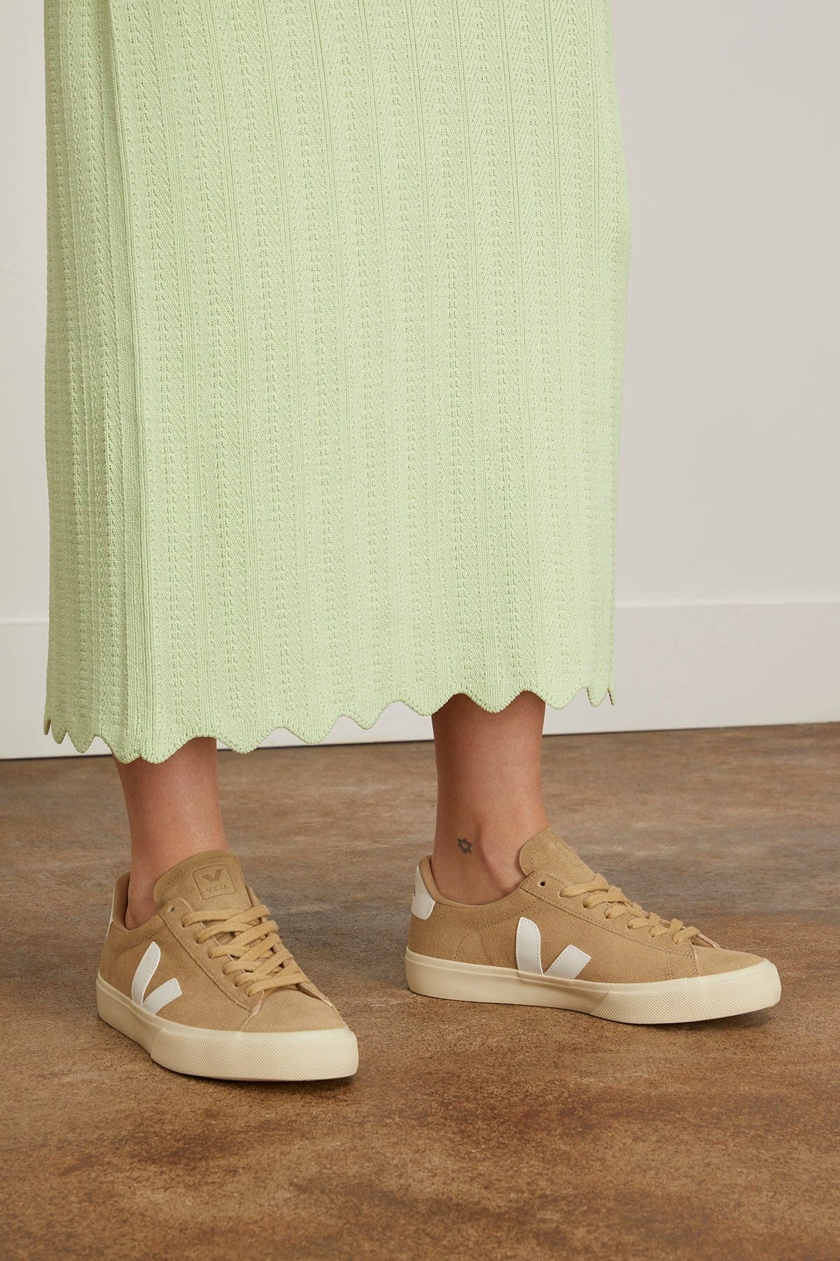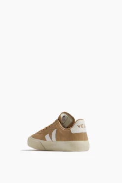 The Veja Campo Sneaker in Dune White is a neutral suede sneaker with white accents. The suede is made from the underside of bovine leather previously brushed to make it softer and more flexible. It comes from farms in the south of Brazil (Rio Grande do Sul). It is tanned in Brazil, without using any hazardous or prohibited chemicals. VEJA uses conventional dyes that comply with regulations. Special attention is paid to water usage during the tanning process. The suede is also coated with water-repellent oils without PFCs (chemical compounds) to protect the sneakers from light rain.